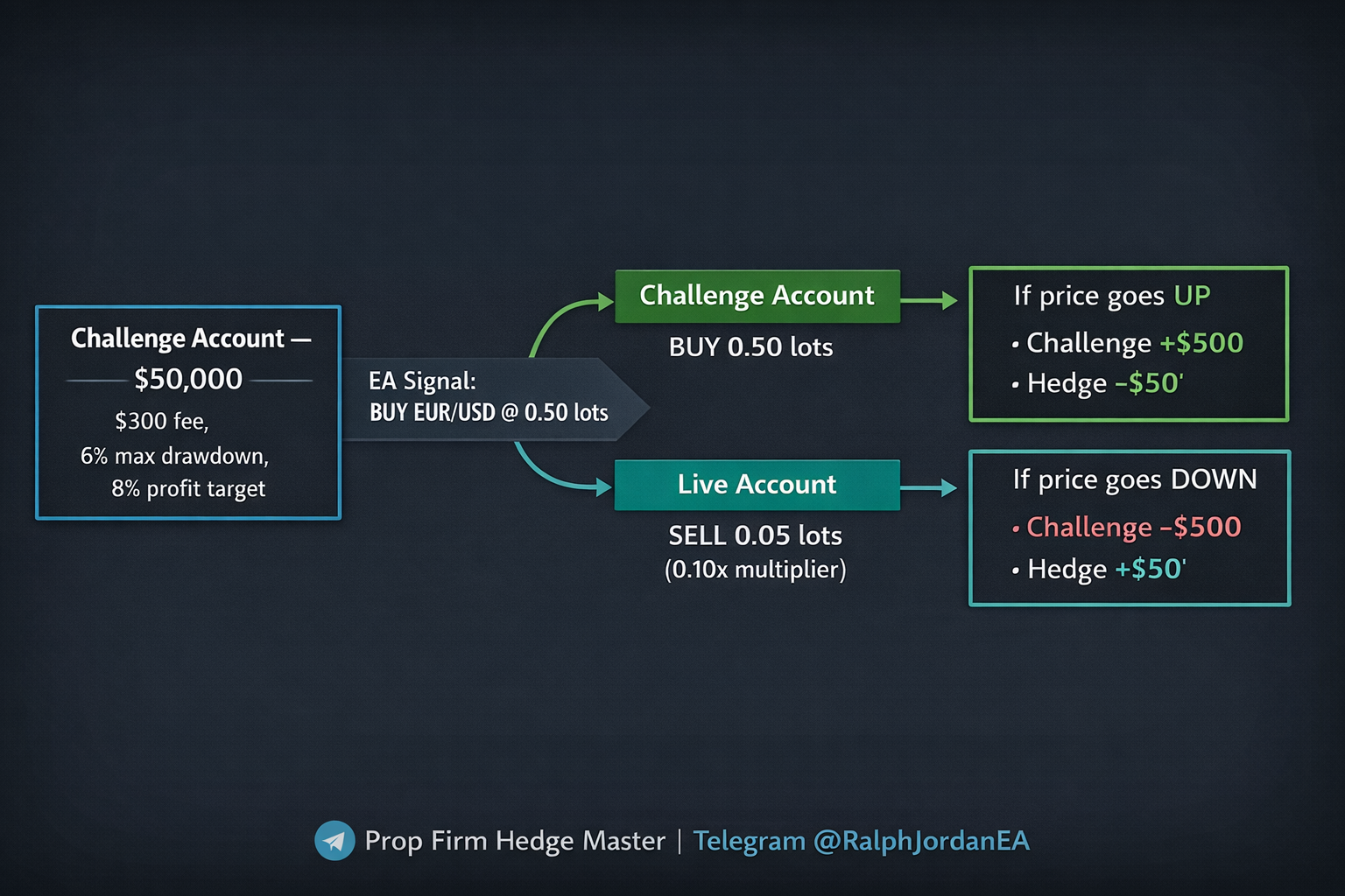 The lot multiplier determines how large the hedge trades are on your live account relative to the challenge trades. It answers the question: "How much do I need to make on the hedge to recover my fee if the challenge fails?"
