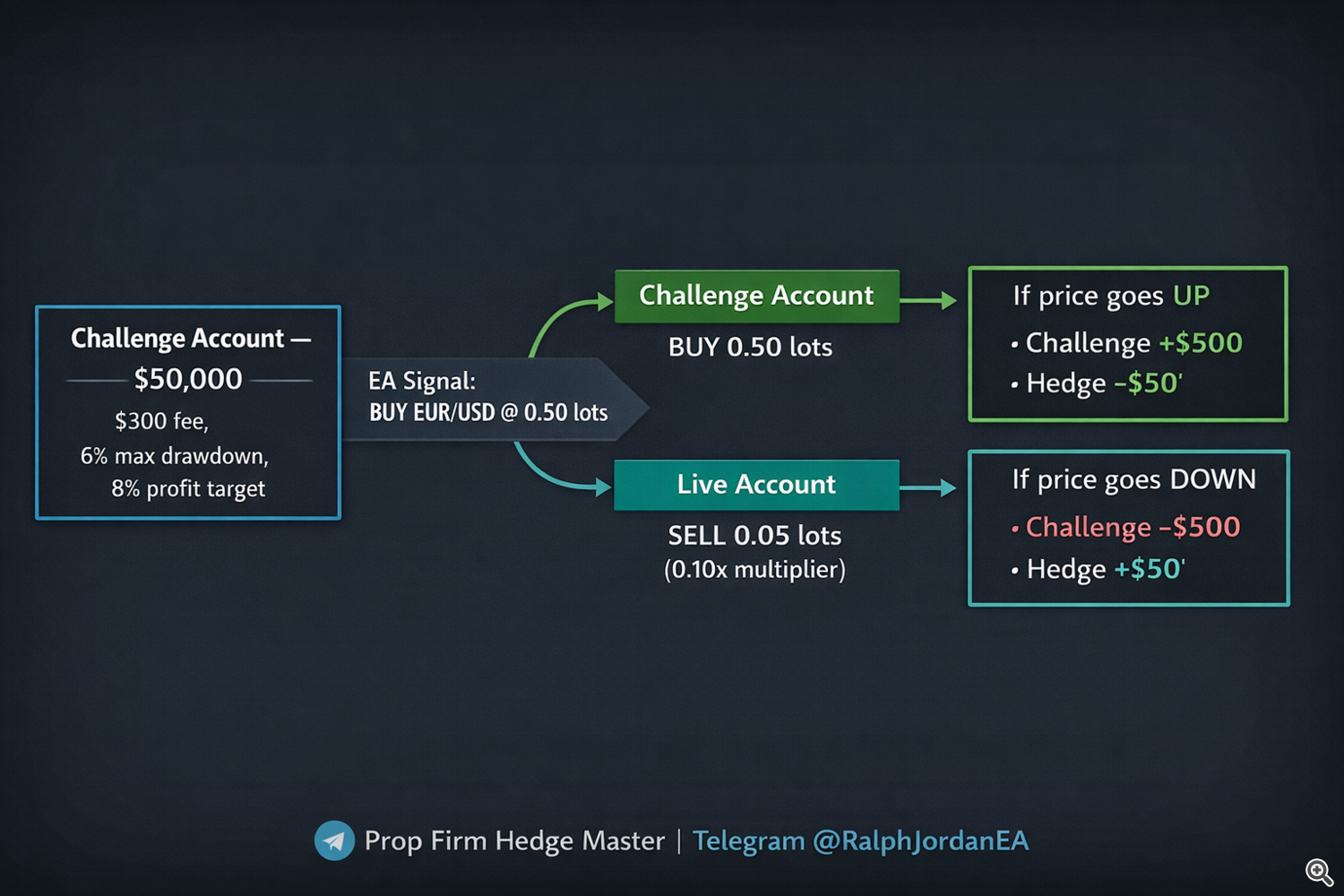 Over many winning trades: The challenge account builds toward the profit target. The live account takes small hedge losses along the way. When you pass the challenge, those hedge losses are the "price" you paid for the safety net. And you now have a funded account worth far more than what the hedge cost you.
