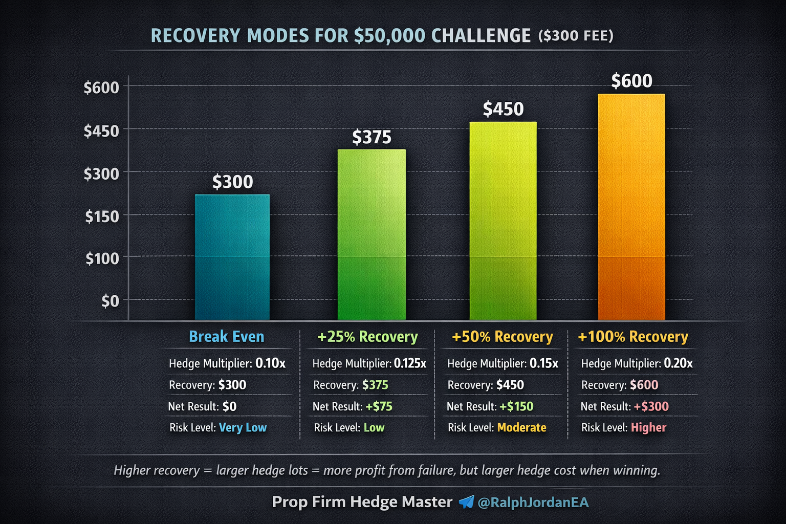 The tradeoff is simple: higher recovery = larger hedge lots = more profit when the challenge fails, but also larger losses on the hedge when the challenge is winning.