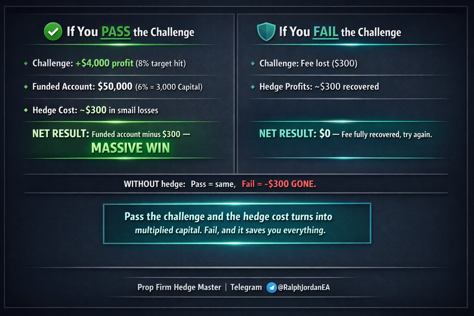 Pass the challenge and the hedge cost turns into multiplied capital. Fail, and it saves you everything.