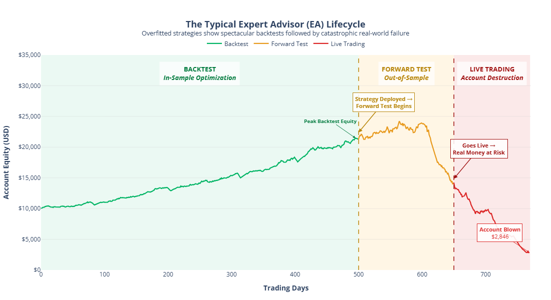 The algorithmic trading space, particularly in retail markets, faces a fundamental credibility problem. The pattern is predictable and pervasive: systems demonstrate spectacular backtest performance, followed by rapid degradation in forward testing, culminating in account destruction during live deployment. This failure mode stems from a single root cause—optimization for in-sample performance without rigorous out-of-sample validation.