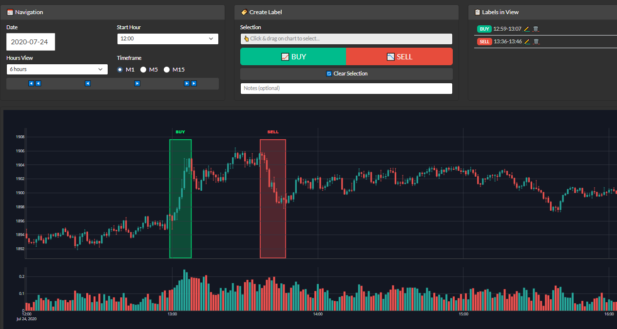 Figure 3: Manual labeling interface showing XAUUSD price action with identified directional zones. The labeled BUY and SELL regions represent profitable moves used as training targets; the model learns to predict these moves using features calculated from preceding market data.
