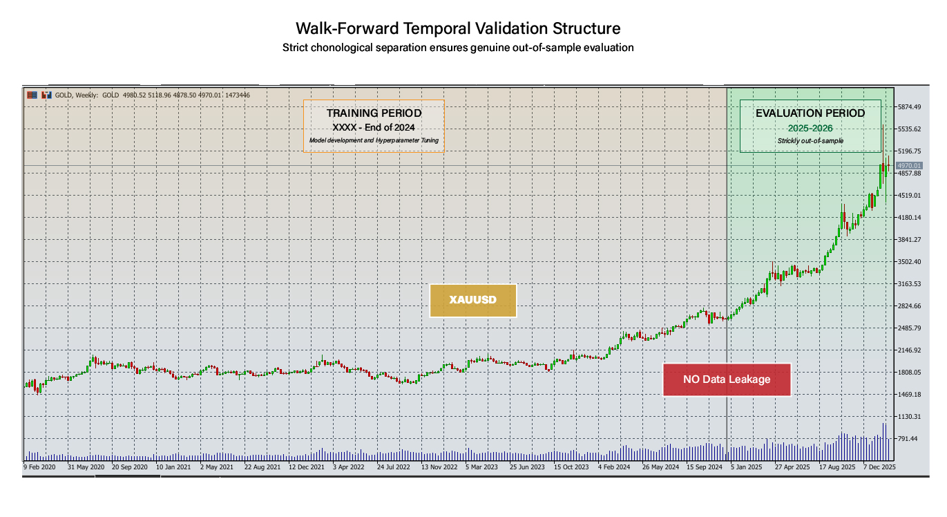 Figure 4: Temporal data separation for walk-forward validation. Training data extends through end of 2024; all 2025-2026 evaluation represents strictly out-of-sample performance on data not used for training.