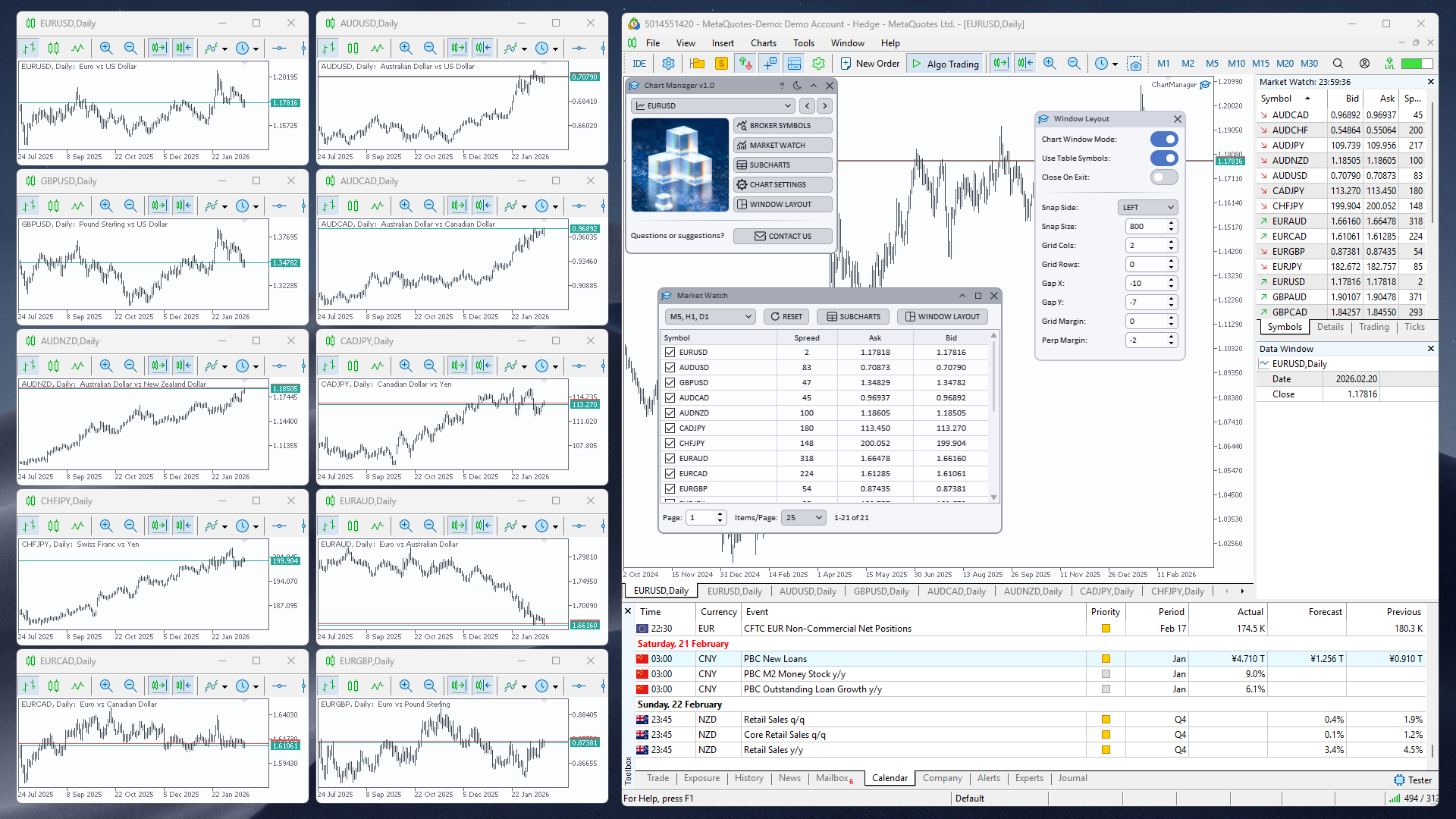You trade 6–8 currency pairs and want to see their charts simultaneously. Open the Window Layout window, set Snap Side = Right, Grid Cols = 2, Grid Rows = 4. Enable Chart Window Mode and Use Table Symbols. Eight charts will automatically line up in a 2×4 grid to the right of the terminal.