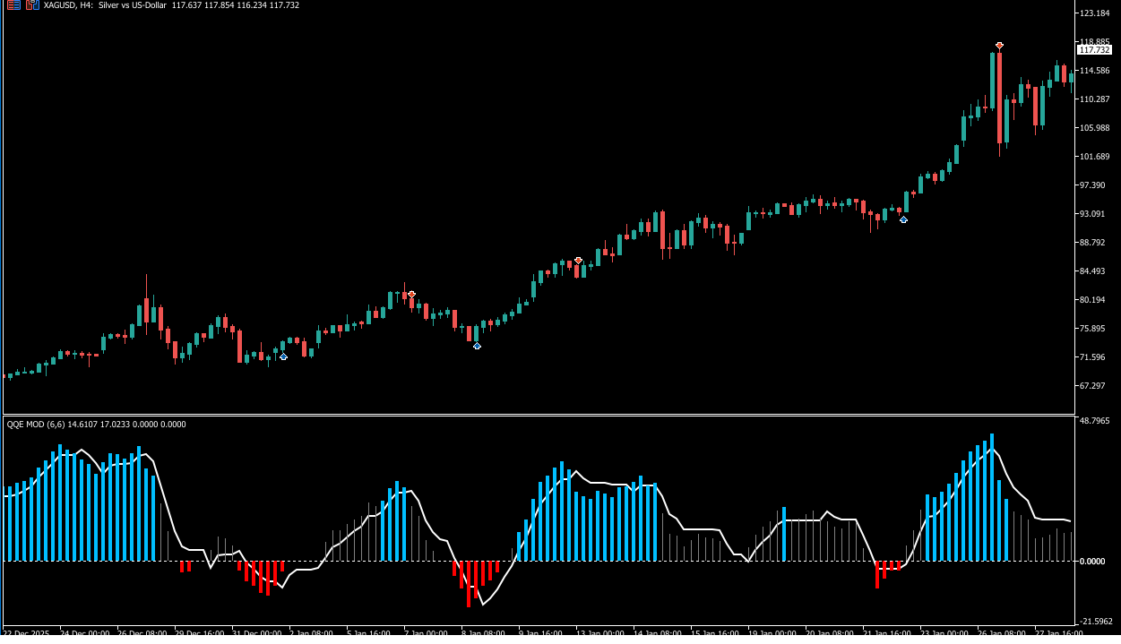 The QQE algorithm takes the smoothed RSI values and combines them with the Average True Range (ATR). By adding dynamic volatility bands to the RSI momentum, the QQE creates a much more robust directional filter. It only signals a trend change when the momentum is strong enough to break through the current market volatility.