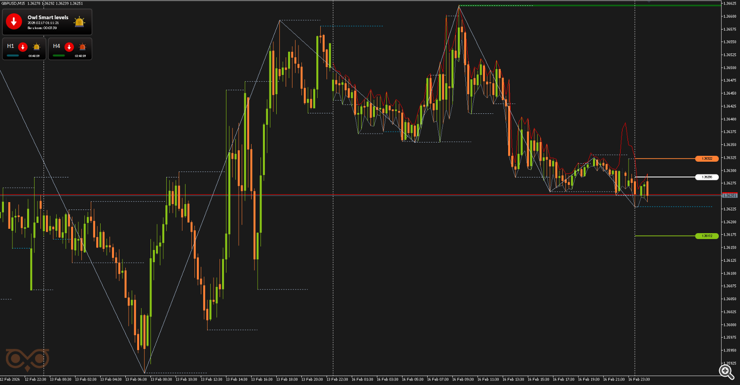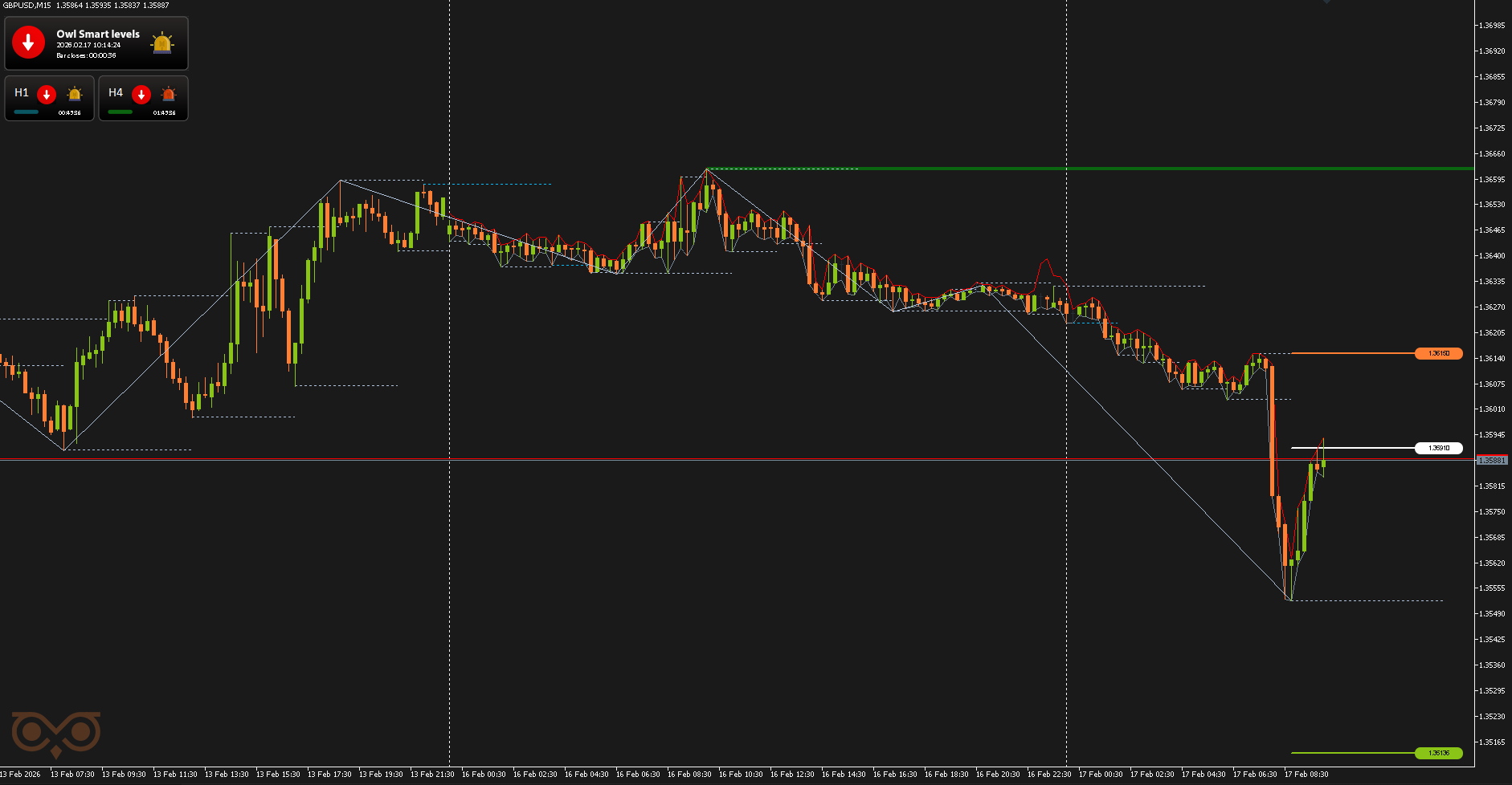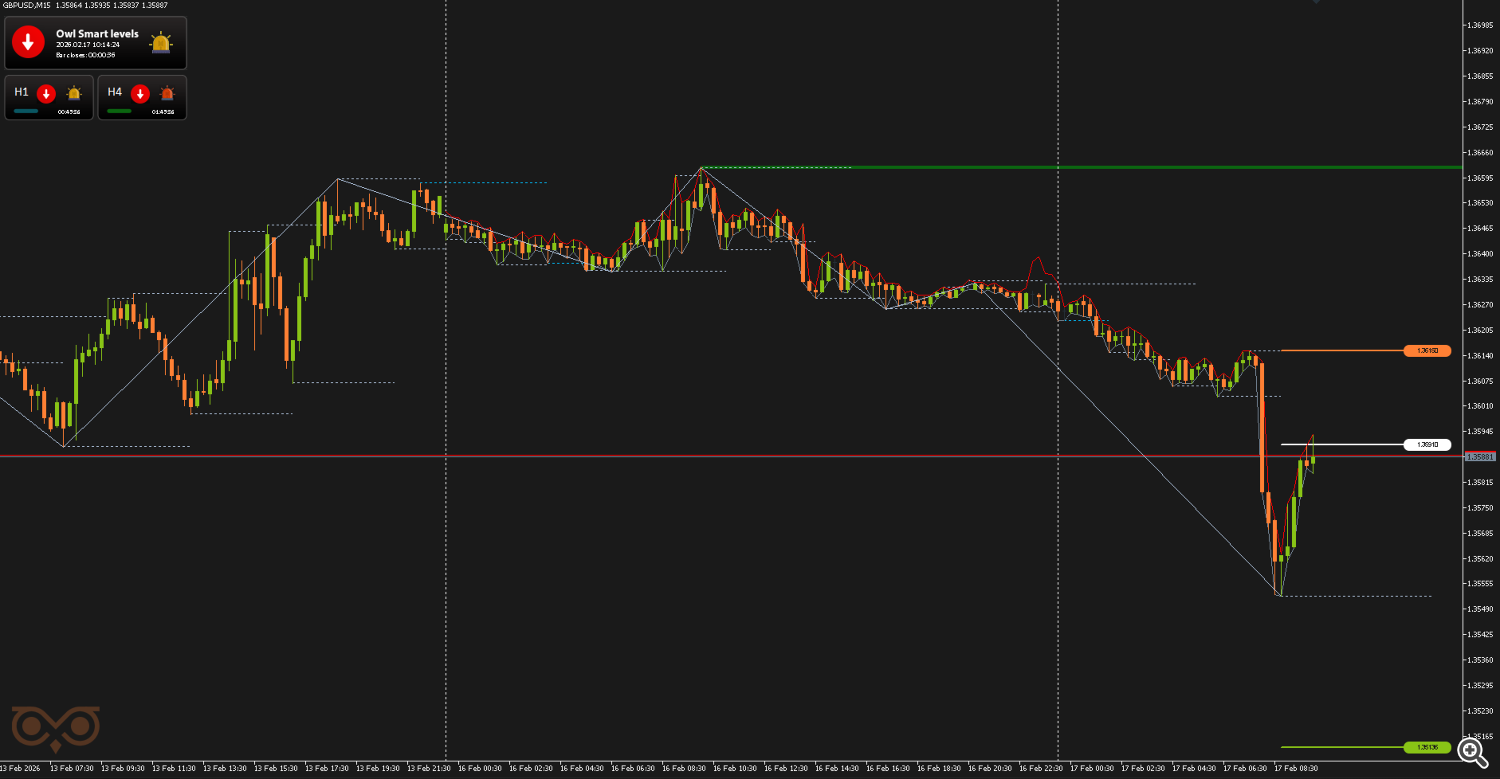 The first trade on the GBPUSD currency pair was opened by the signal of the Owl Smart Levels indicator on February 17, 2026. At the time of entry, the market was already moving down, so the trade was opened to sell in the direction of the current downward movement.