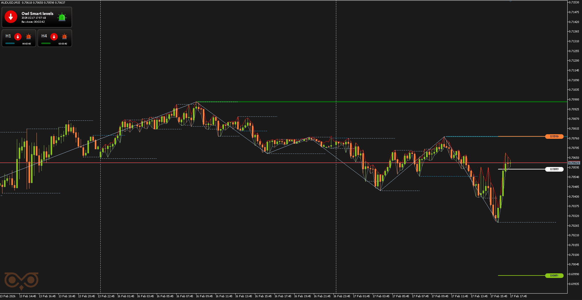 The first trade on the AUDUSD pair was opened by the signal of the Owl Smart Levels indicator on February 17, 2026. At the time of entry, the pair was moving downwards, so the trade was opened in the direction of the downtrend.