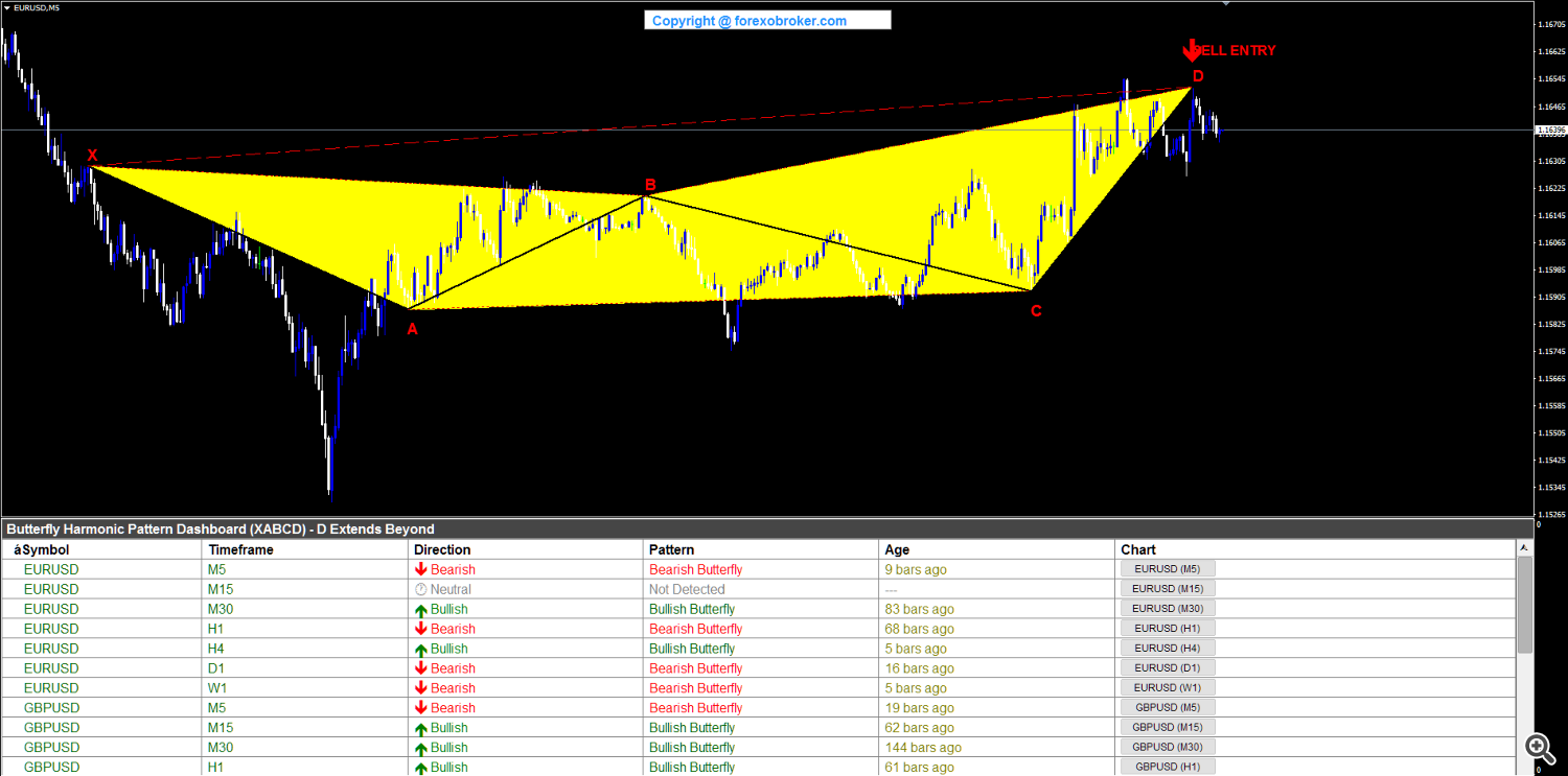 EURUSD on the M5 timeframe produced a bearish Butterfly signaling a fast-timeframe reversal opportunity. The X point formed at a swing high near 1.1630, with A dropping to a swing low around 1.1590. B retraced upward to approximately 1.1622, sitting close to the 78.6% XAB retracement level. C pulled back to about 1.1590, and D completed at a swing high near 1.1650 -- critically, D was above X, confirming the Butterfly extension structure. The SELL ENTRY arrow appeared at D, and the three yellow triangles (XAB, ABC, BCD) clearly outlined the five-point Butterfly geometry. The dashed X-D line showed the extension beyond the starting level, and the dashboard row displayed EURUSD on M5 with Bearish direction in red.