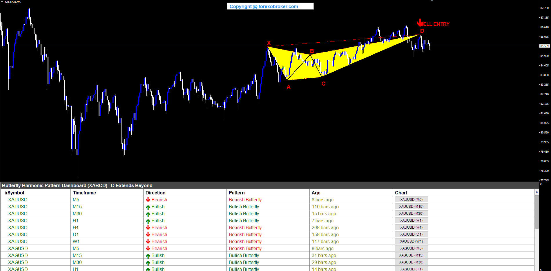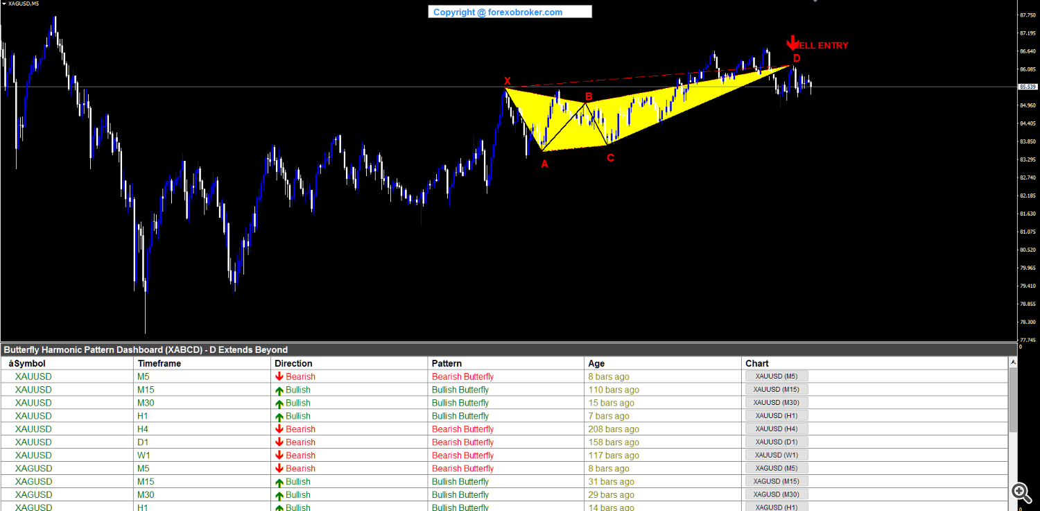 Silver on the M5 timeframe formed a bearish Butterfly signaling a short-term sell opportunity. X was identified at a swing high near 85.50, A dropped to a swing low around 83.40. B retraced to approximately 84.50 at the 78.6% XAB level, C pulled back to about 83.40, and D completed at a swing high near 86.60 -- above X, confirming the extension. The SELL ENTRY at D marked the pattern completion where the XAD extension placed price beyond the original swing high. The dashed X-D line clearly showed how D had overextended past X, and the dashboard displayed the XAGUSD M5 row with Bearish direction.