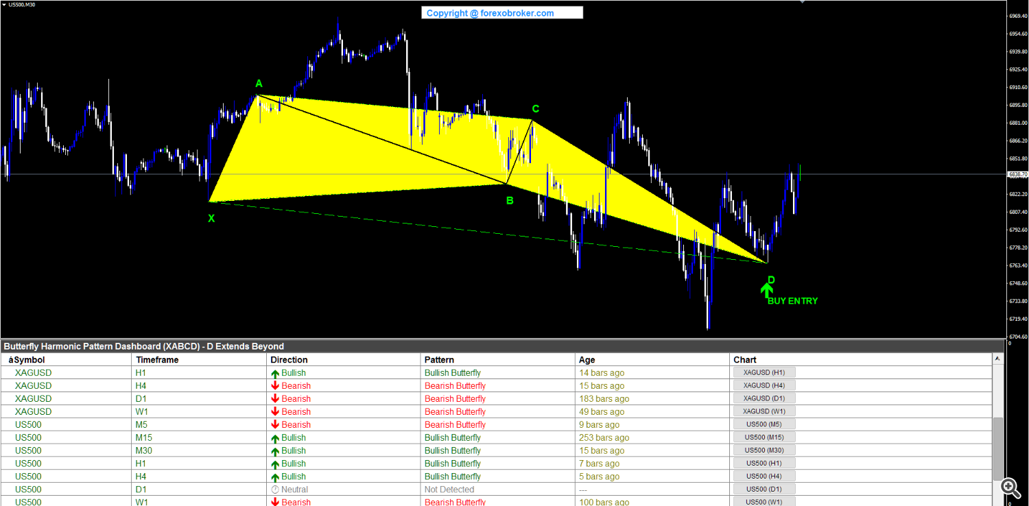 The S&P 500 index on the M30 chart produced a bullish Butterfly demonstrating that extension patterns occur across asset classes. X formed at a swing low near 6835, A at a swing high around 6920. B retraced to approximately 6835, C rose to about 6880, and D completed at a swing low near 6750 -- significantly below X, confirming the bullish Butterfly extension. The BUY ENTRY at D signaled a long entry on the index at a Fibonacci-defined support level where the overextension below X created a high-probability reversal zone. The dashboard showed the US500 row alongside forex and metals patterns.