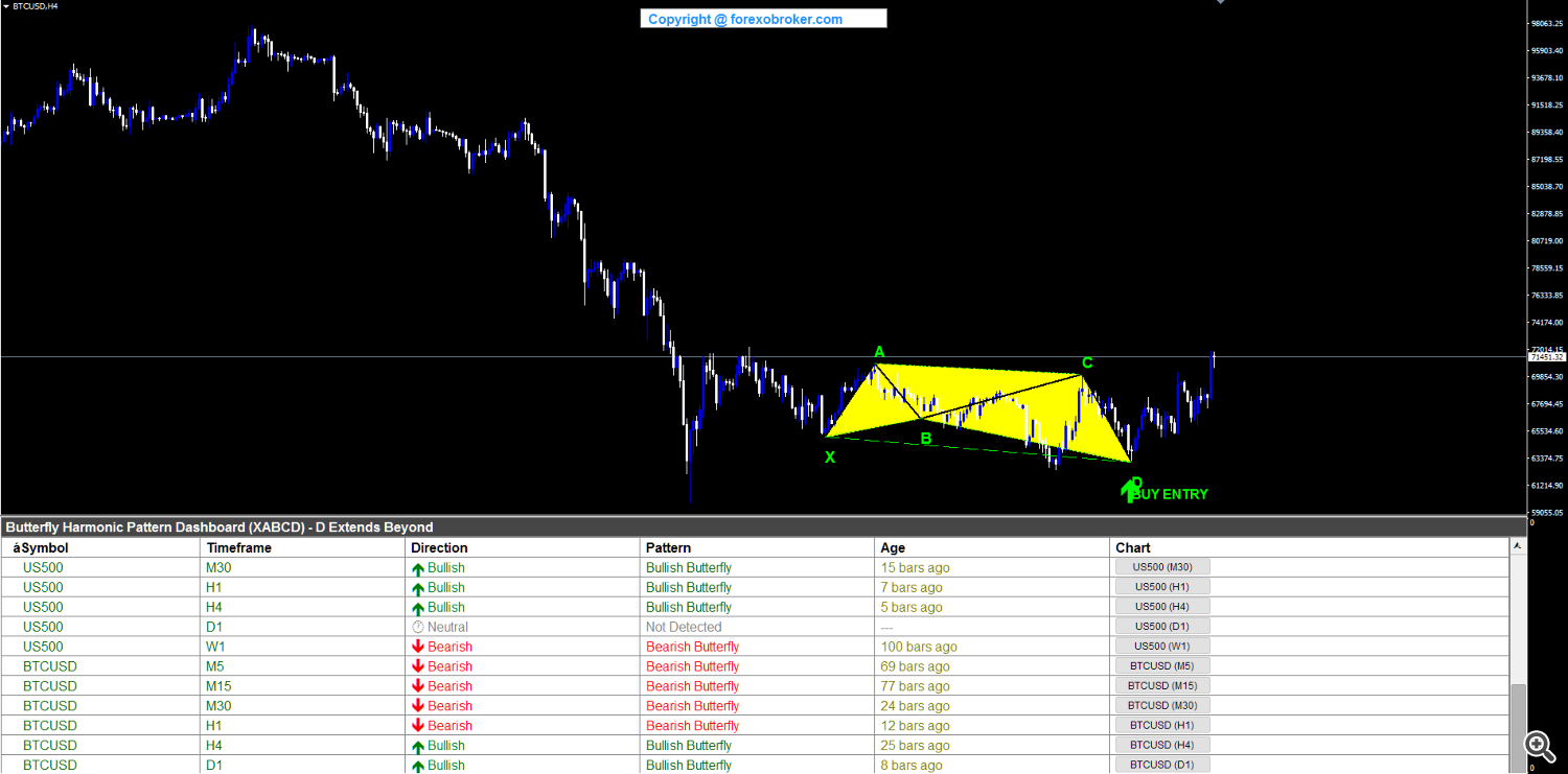 Bitcoin on the H4 chart formed a large bullish Butterfly spanning thousands of points in price. X was established at a swing low near 64,500, A surged to a swing high around 71,000. B retraced to approximately 65,500, C rose back to about 70,500, and D completed at a swing low near 61,500 -- well below X, confirming the extension structure. The massive price range between X and A produced three prominent yellow triangles that dominated the chart. The BUY ENTRY at D represented a higher-timeframe long opportunity on Bitcoin at the XAD extension zone, where the overextension past X by thousands of dollars created a significant reversal zone. The dashboard captured this H4 setup, demonstrating the indicator's ability to detect Butterfly extension patterns across crypto assets on swing trading timeframes.
