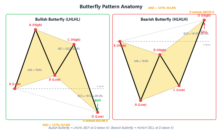 The Butterfly pattern consists of five consecutive swing points -- labeled X, A, B, C, and D -- that form a specific geometric structure with four Fibonacci relationships between its legs. What fundamentally distinguishes the Butterfly from retracement patterns like the Bat and Gartley is its nature as an extension pattern: the D point extends beyond the X point, meaning the pattern "breaks" its starting level before completing.