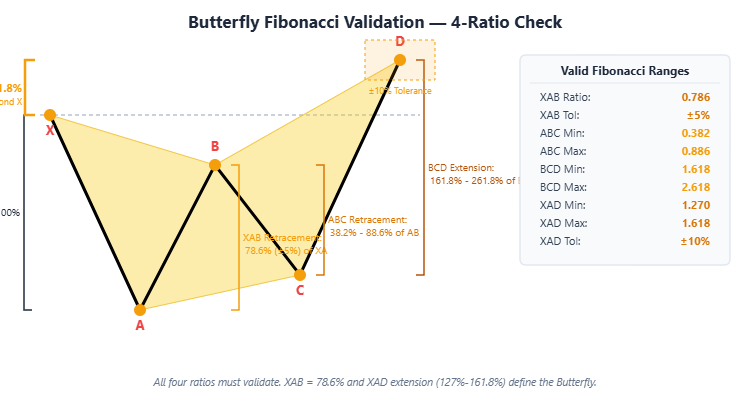 Now multiply that by twenty symbols across nine timeframes. The Butterfly harmonic pattern is one of the most visually deceptive structures in harmonic trading -- it looks like a pattern that has failed and broken the starting level, when in reality that extension beyond X is precisely what defines it. Each potential Butterfly requires identifying five confirmed swing points in the correct alternating sequence, then measuring and validating four separate Fibonacci ratios against acceptable ranges, including an extension ratio greater than 1.0. Manual scanning for Butterfly patterns across a full watchlist is not just slow; it is operationally unfeasible.
