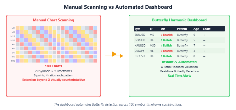 A typical multi-asset trader monitors 20 symbols -- major and minor forex pairs, gold, silver, crypto assets, and indices. With nine available timeframes (M1 through Monthly), that produces 180 possible chart combinations. Scanning each chart for five-point Butterfly patterns requires identifying alternating swing highs and lows, then measuring four separate Fibonacci ratios including the extension calculation at D. At even 50 seconds per chart (longer than simpler patterns because the XAD extension requires more careful measurement), a full scan takes over two and a half hours -- by which time the majority of the setups you were looking for have already played out or disappeared entirely.