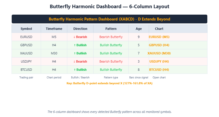Figure 4. The 6-column dashboard shows every detected Butterfly pattern across all monitored symbols and timeframes.