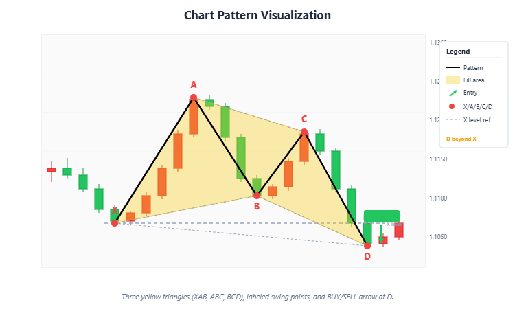 The D point completes the pattern and signals a SELL entry. Price has extended above the X level to a Fibonacci-defined resistance zone. The requirement that D exceeds X confirms the extension structure, and the XAD ratio between 127% and 161.8% places D at a zone where the overextension is statistically likely to reverse.