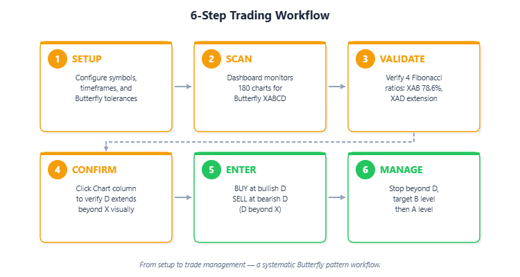 Figure 6. From setup to trade management -- a systematic workflow using the Butterfly Harmonic Dashboard.