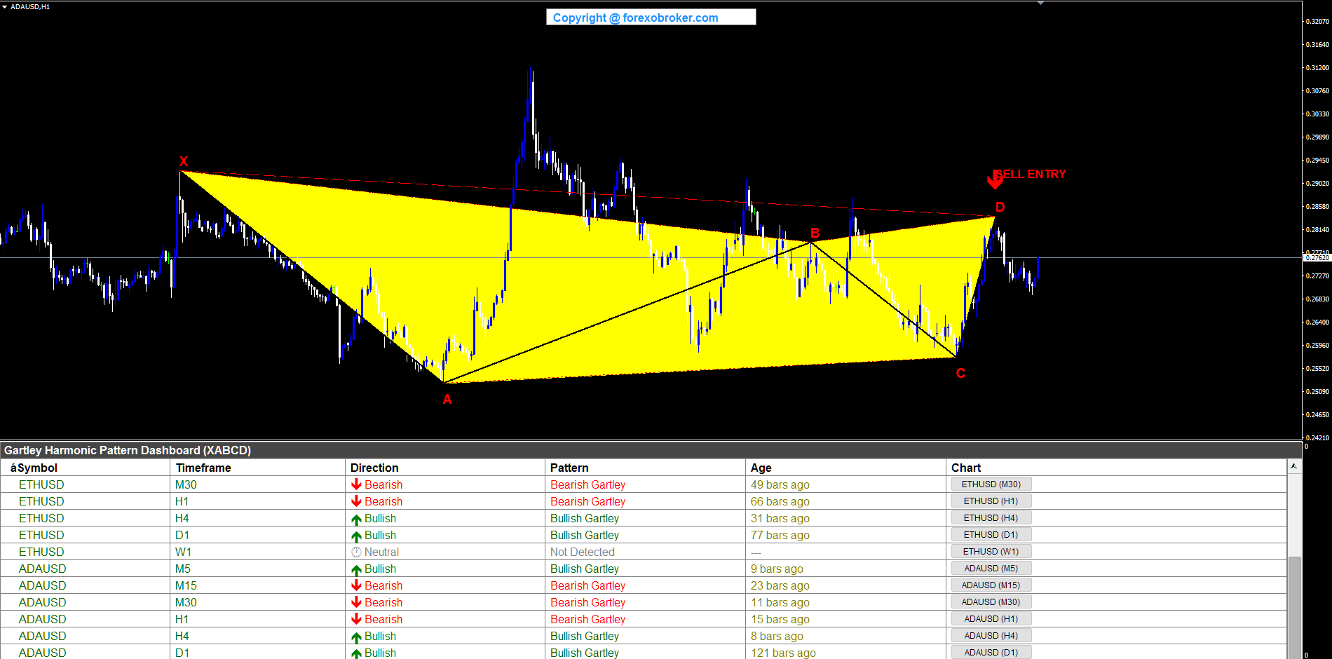 Cardano on the hourly chart formed a bearish Gartley spanning a significant price range. X was established at a swing high, A dropped to a swing low. B retraced upward to the 61.8% golden ratio of XA, C pulled back lower but stayed above A, and D completed at a swing high at the 78.6% XAD retracement below X. The SELL ENTRY at D represented a swing short opportunity on Cardano at a Fibonacci-defined resistance zone. The dashboard captured this H1 setup, demonstrating the indicator's coverage across multiple crypto assets on different timeframes.