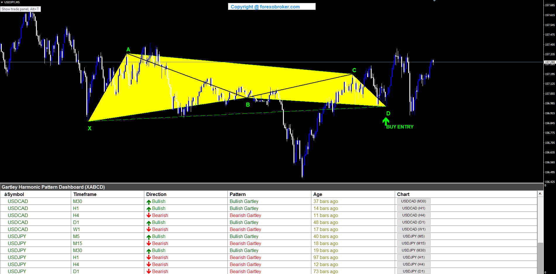 USDCAD on the hourly chart formed a bullish Gartley suitable for intraday swing trading. X was identified at a swing low, A at a swing high above. B retraced downward to the 61.8% retracement of XA, remaining above X. C pushed higher but stayed below A, and D completed at a swing low at the 78.6% XAD retracement -- above X. The BUY ENTRY at D offered a long entry at a Fibonacci-defined support zone where the golden ratio at B and the 78.6% XAD retracement converged to define valid Gartley geometry. The dashboard showed USDCAD alongside other symbols, demonstrating the multi-symbol scanning across the H1 timeframe.