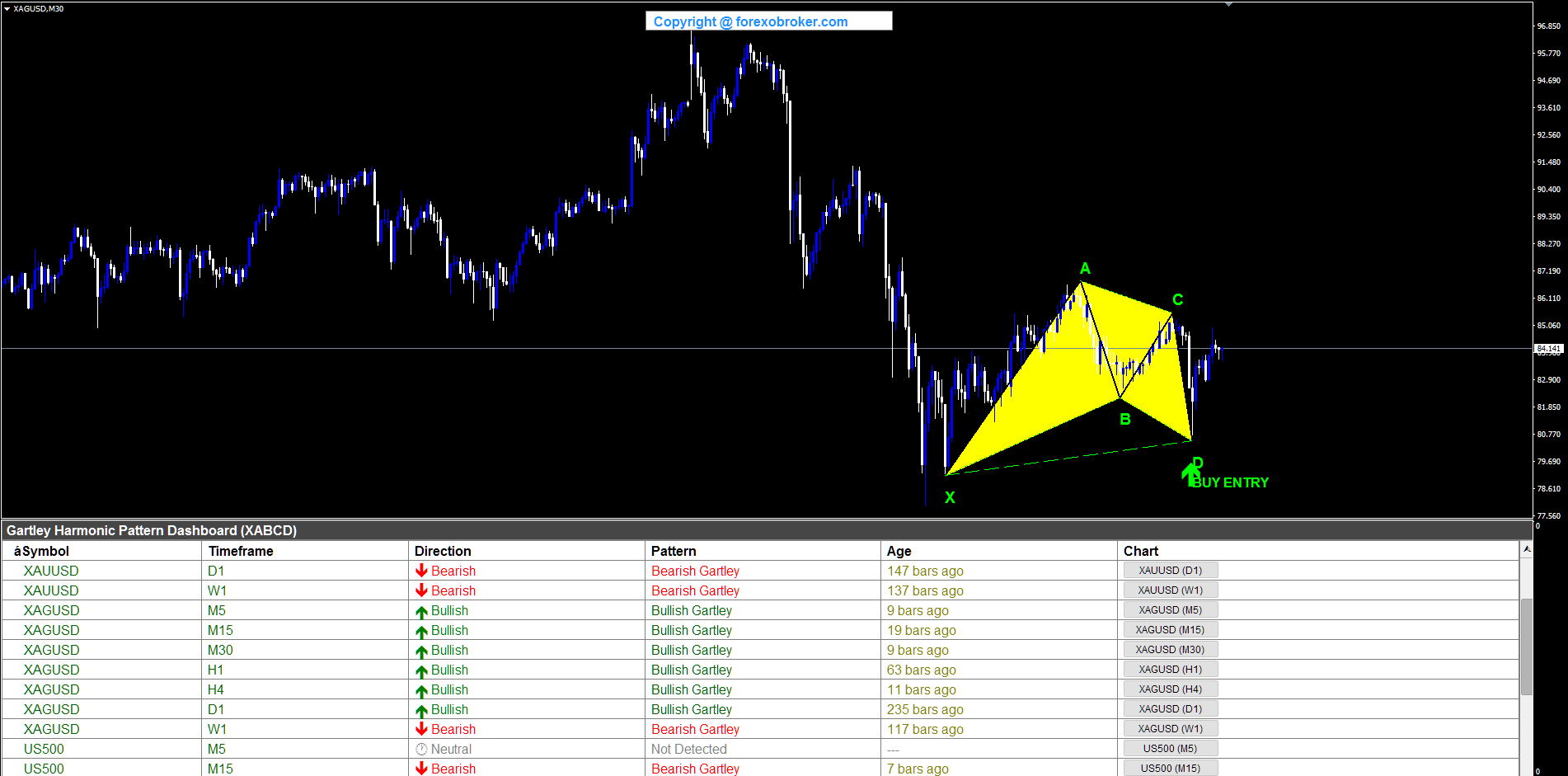 The yen pair on the M5 chart produced a compact bullish Gartley suitable for forex scalping. X formed at a swing low, A at a nearby swing high. B retraced to the golden ratio level, C rose but stayed below A, and D completed at the 78.6% XAD retracement. The tight price range on the M5 timeframe meant the pattern was compact, but all three Fibonacci ratios validated correctly. The BUY ENTRY signal at D appeared with a low Age value, and the dashboard captured this fast-timeframe setup alongside detections on higher timeframes.