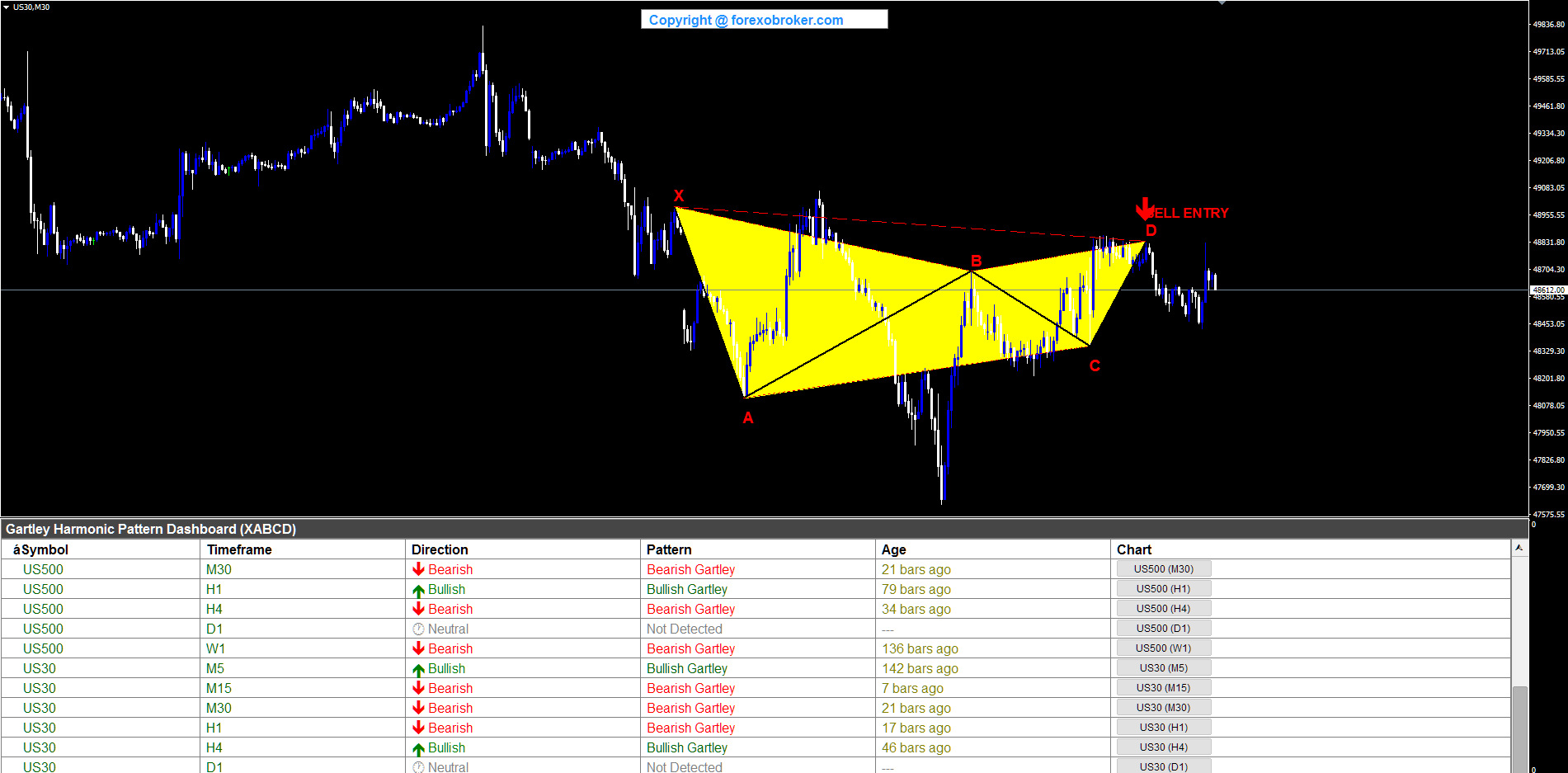 The Dow Jones index on the M30 chart showed a bearish Gartley suitable for intraday index trading. X formed at a swing high, with the five-point HLHLH structure unfolding across multiple M30 bars. B landed at the critical 61.8% golden ratio retracement, and D completed at the 78.6% XAD level below X. The SELL ENTRY arrow confirmed the short setup, and the dashboard row displayed US30 with Bearish direction. The pattern demonstrated the indicator's effectiveness on equity indices alongside forex and metals.