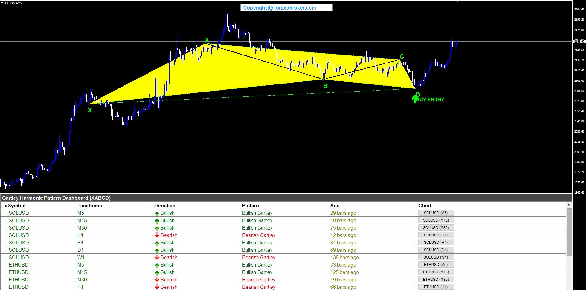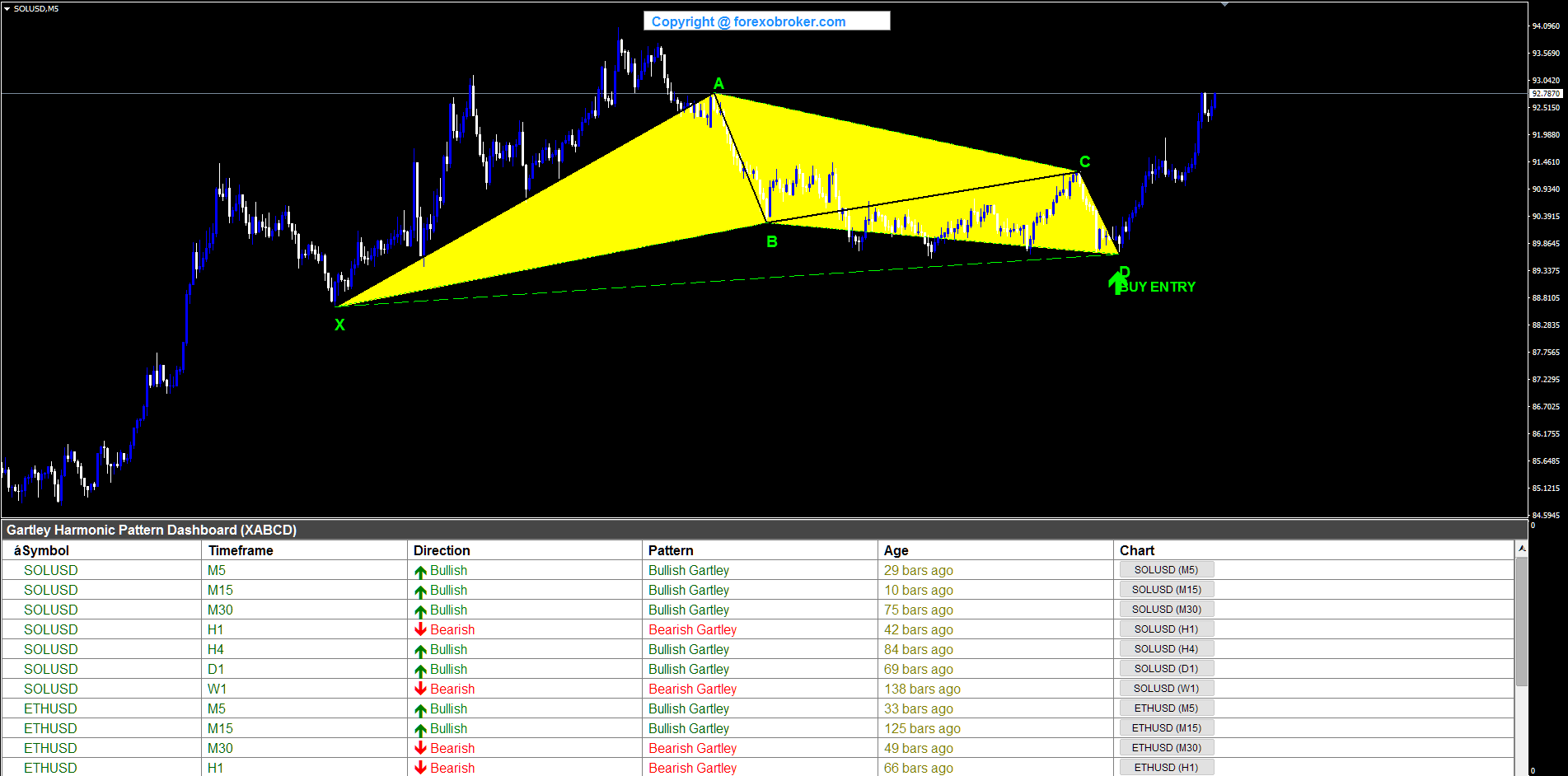 Solana on the M5 timeframe produced a compact bullish Gartley suitable for crypto scalping. The five-point LHLHL structure formed quickly on the fast timeframe, with B landing at the golden ratio retracement of XA and D completing at the 78.6% XAD level above X. The BUY ENTRY arrow appeared at D, and the yellow triangles outlined the Gartley geometry within a tight price range. The dashboard row confirmed SOLUSD on M5 with Bullish direction, demonstrating the indicator's ability to detect Gartley patterns on crypto assets at scalping timeframes.