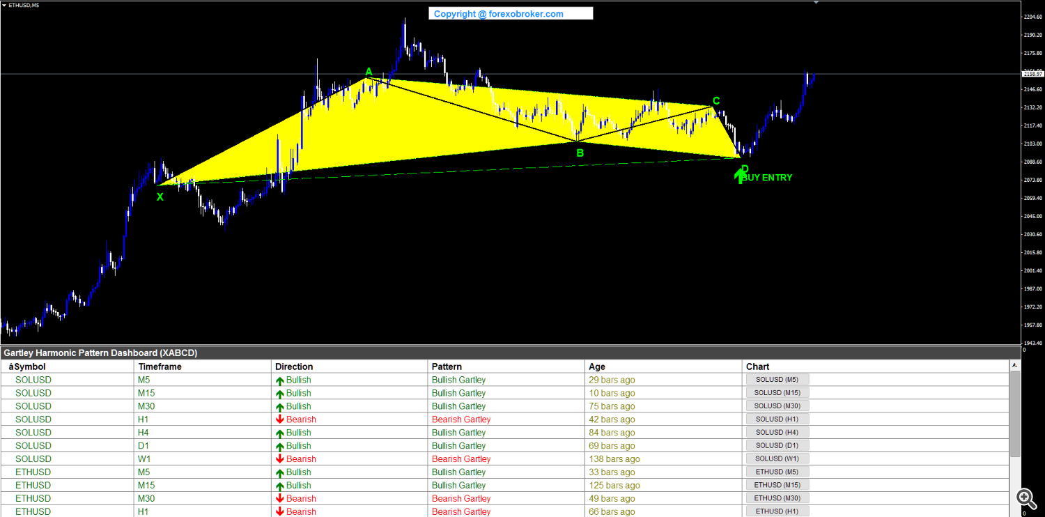 Ethereum on the M5 chart displayed a bullish Gartley with well-defined swing points. X formed at a swing low, A rose to a swing high, B pulled back to the 61.8% level, C pushed higher but stayed below A, and D completed at the 78.6% XAD retracement above X. The BUY ENTRY signal at D offered a long entry on Ethereum after the measured harmonic completion. The fast M5 timeframe made this a quick-turnaround trade, and the dashboard captured it alongside patterns on other crypto and forex pairs.
