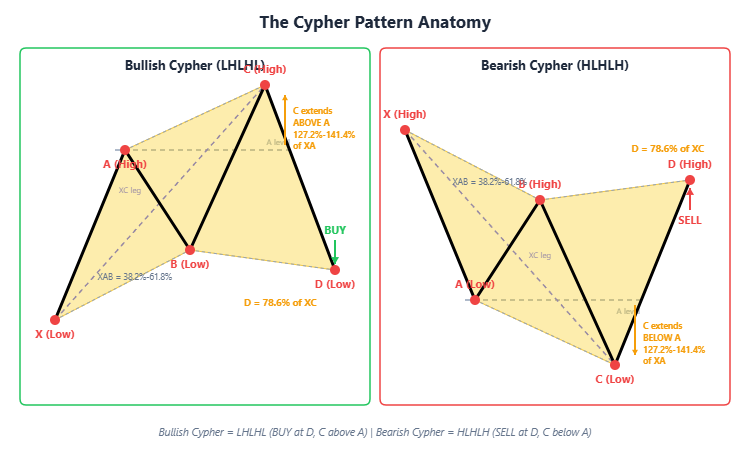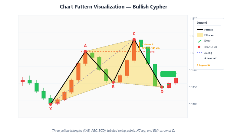 The D point is where the pattern completes, and it represents a BUY entry. The logic is that price has completed a measured retracement of the XA leg (78.6%) and is now at a statistically significant support level defined by the convergence of three Fibonacci relationships. The requirement that D remains above X is critical -- it means the original XA impulse has not been fully reversed, preserving the bullish bias.