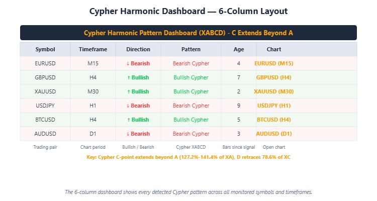 Figure 4. The 6-column dashboard shows every detected Gartley pattern across all monitored symbols and timeframes.