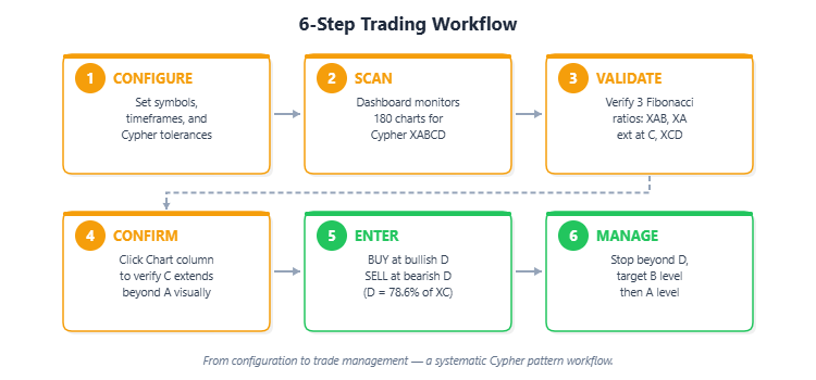 Figure 6. From setup to trade management -- a systematic workflow using the Gartley Harmonic Dashboard.