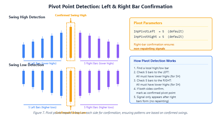Figure 7. Pivot points require confirmation bars on each side, ensuring patterns are based on confirmed swings rather than noise.