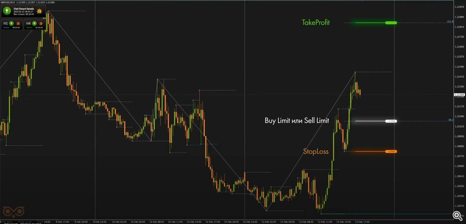 Such corrections allow you to enter the market after a pullback, when the price returns to key levels. In the Owl Smart Levels system, these moments are used to find entry points using fractals, ZigZag, and Fibonacci levels.