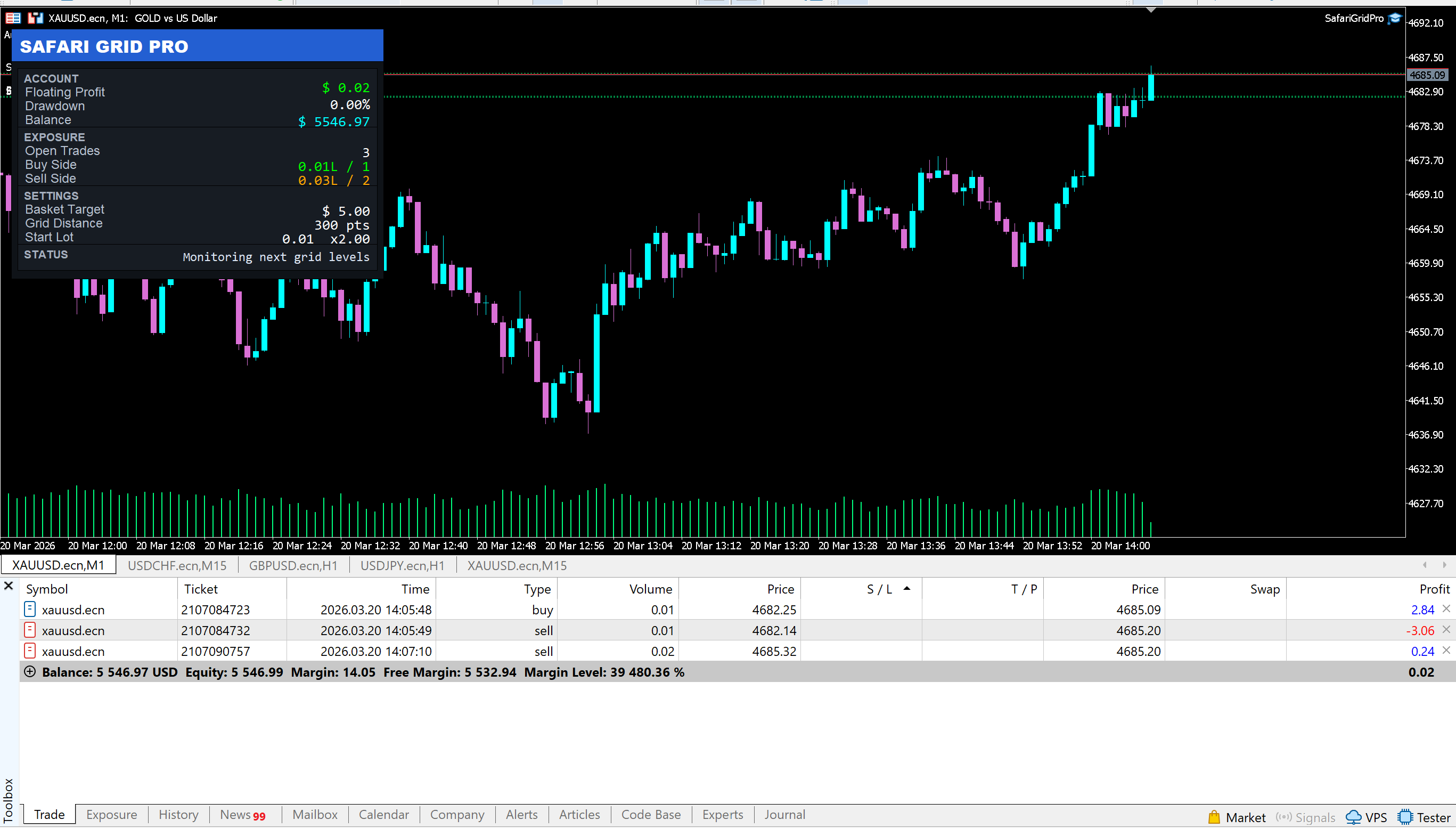 Many EAs give very little visual feedback once they are attached to the chart. Safari Grid Pro was built with a chart panel so that the trader can quickly see what is happening without digging into multiple MT5 windows.