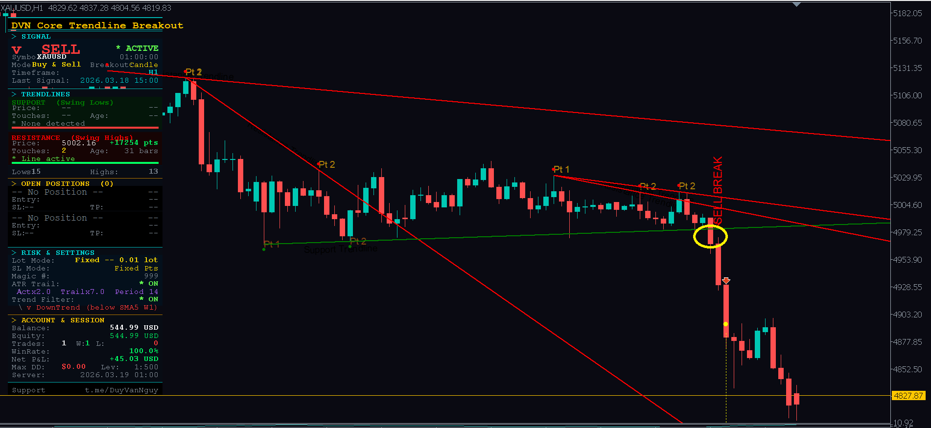 Support trendlines = SHORT signal on breakdown. Resistance trendlines = LONG signal on breakout. Clean, logical, repeatable.