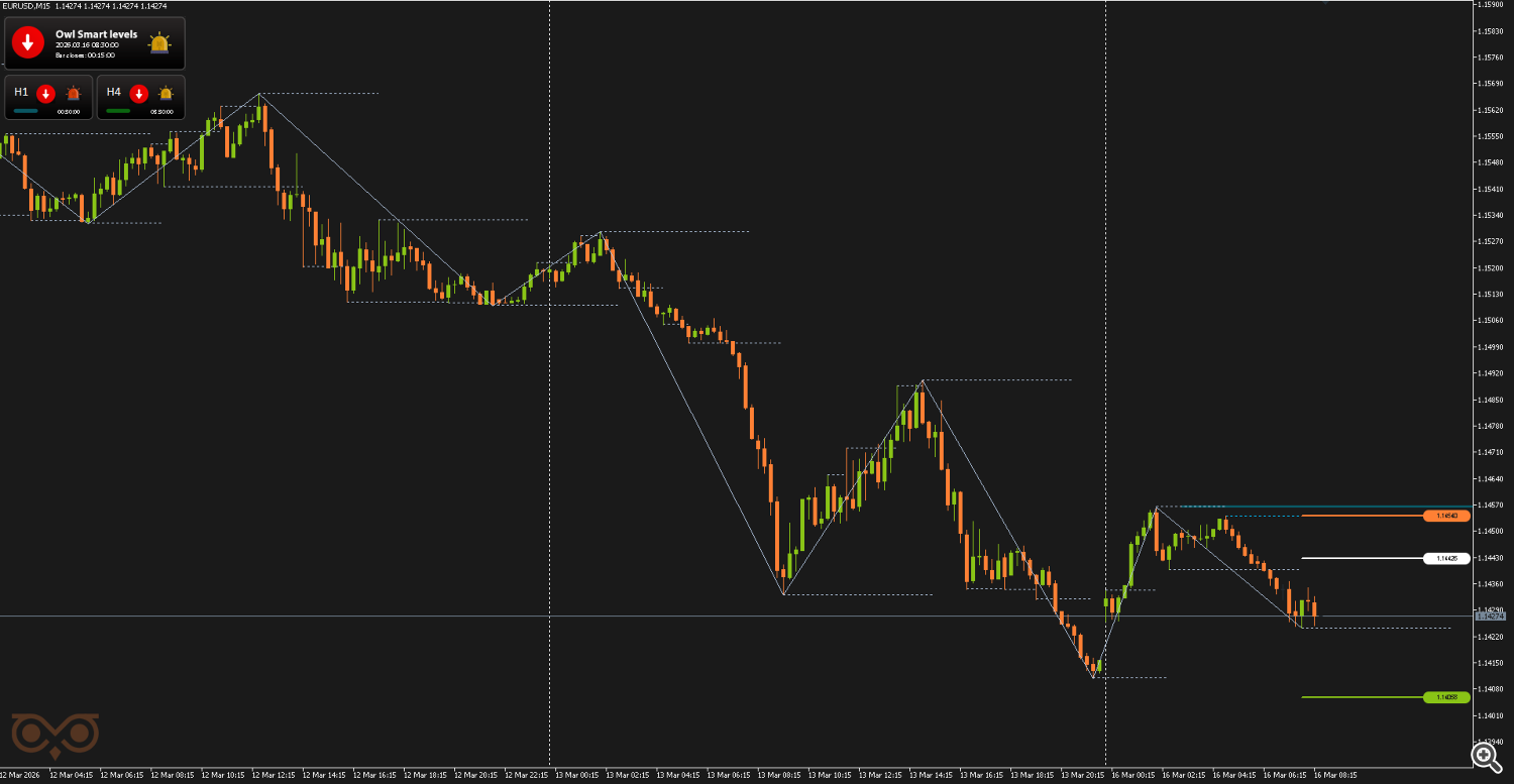 For convenience and timely receipt of signals I use the Owl Smart Levels Indicator. The main trading timeframe is M15, while the H1 and H4 timeframes are used to confirm the trend direction of the higher timeframe.