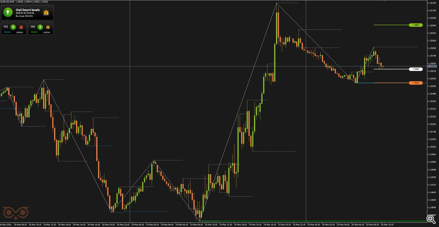 The second EURUSD trade was opened on March 20 after a buy signal from the Owl Smart Levels indicator. By then, the market had already shown a strong upward move and was in a pullback phase after the bullish impulse.