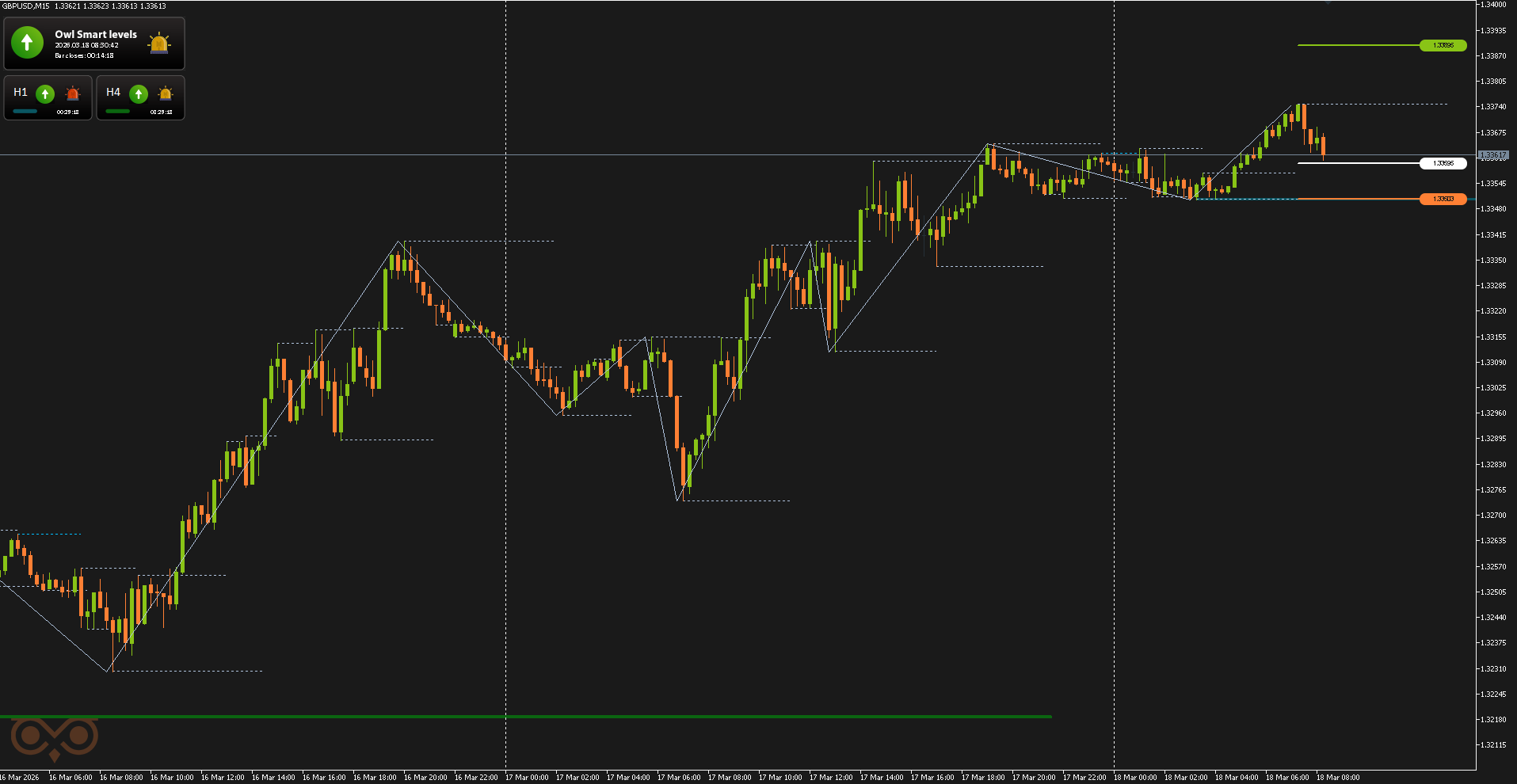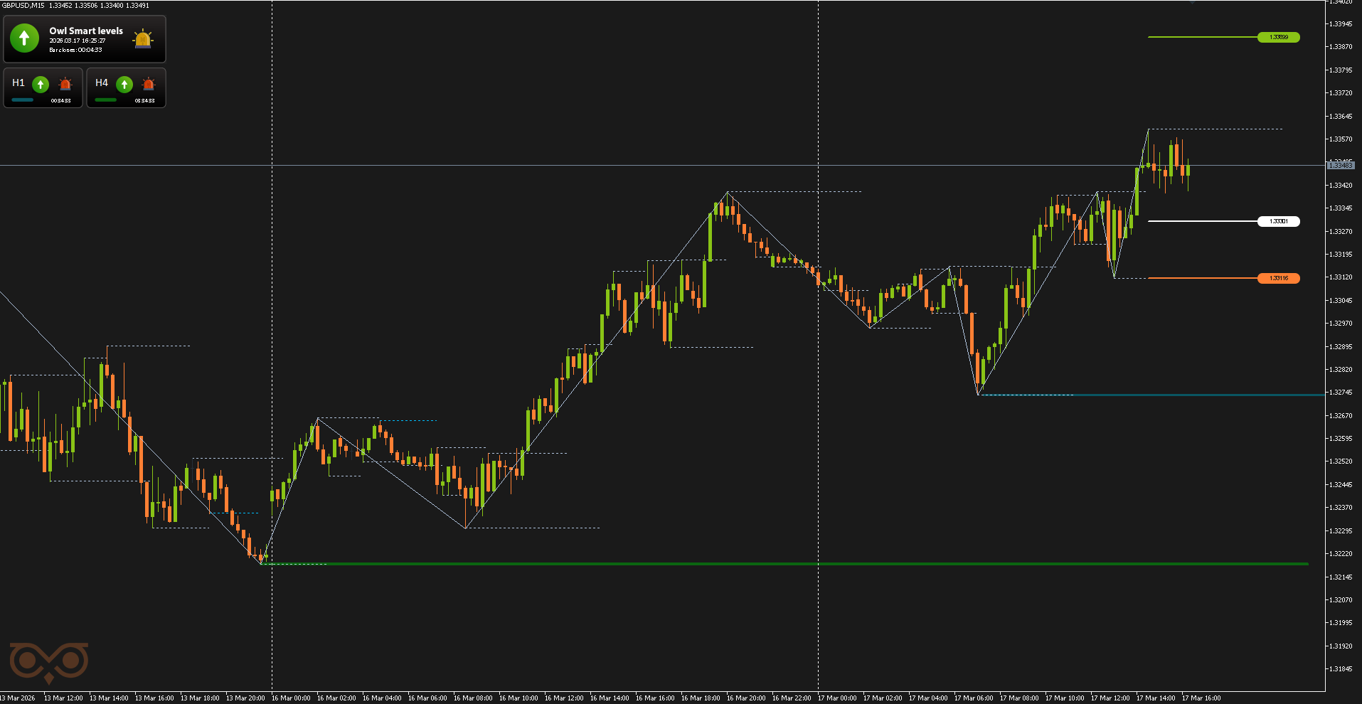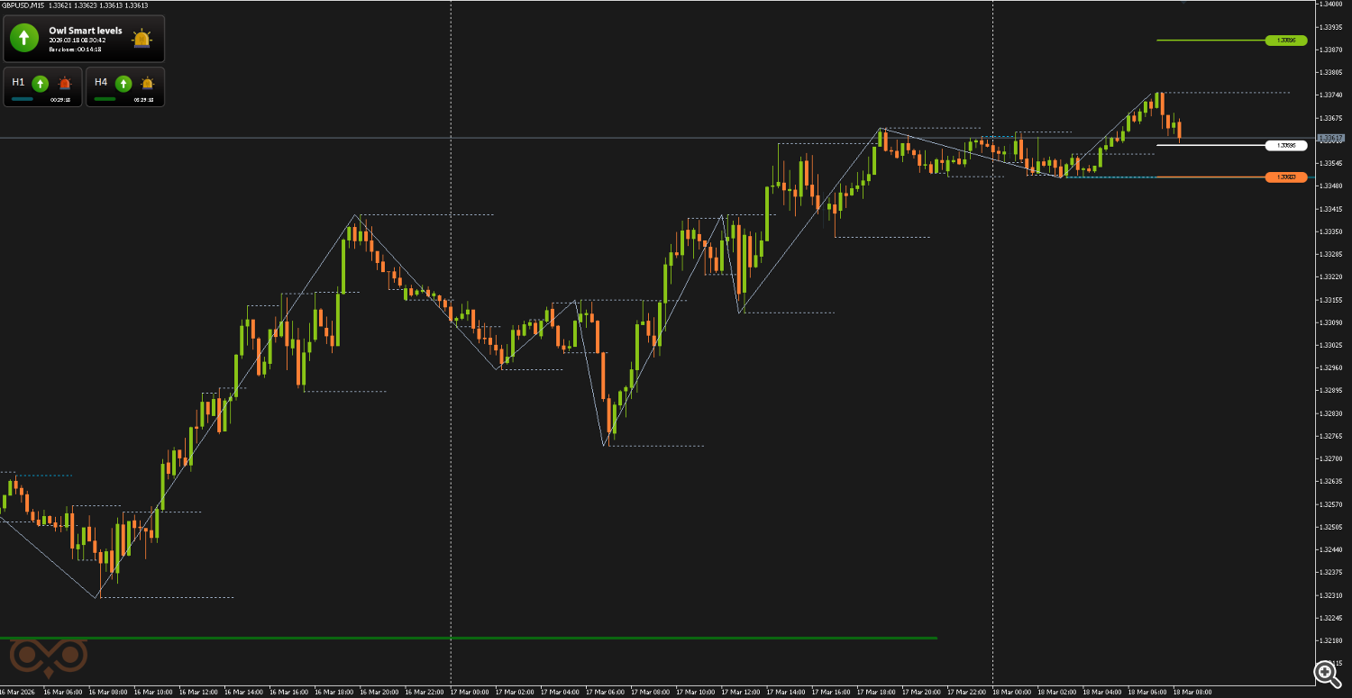 The first trade on the GBPUSD pair was opened on March 17 following a buy signal from the Owl Smart Levels indicator. At that point, the market had started reversing upward after a prior decline and was forming a bullish structure.