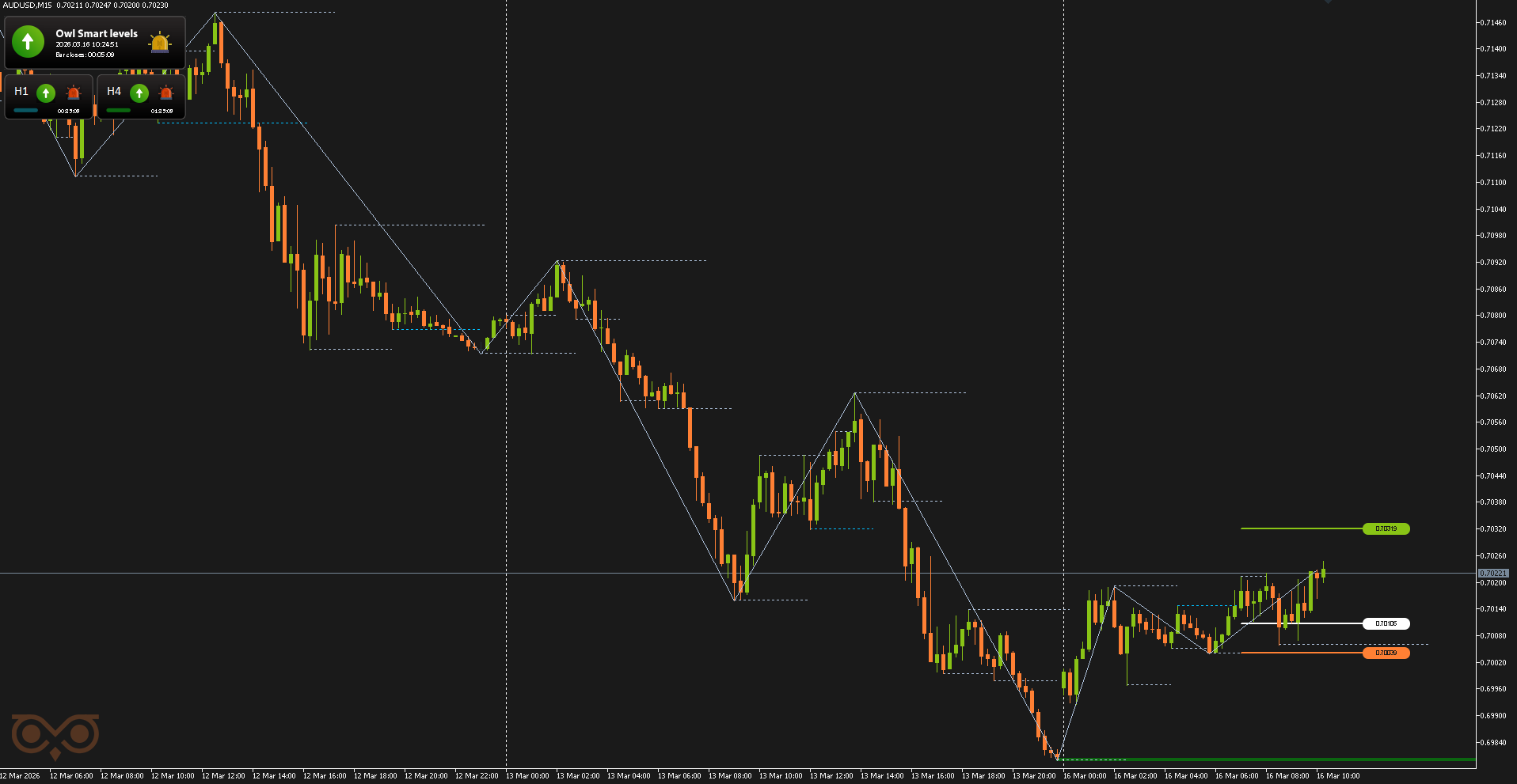 The first trade on the AUDUSD pair was opened on March 16 after a buy signal from the Owl Smart Levels indicator. At the time, the market was recovering after a decline and forming a local bullish structure.
