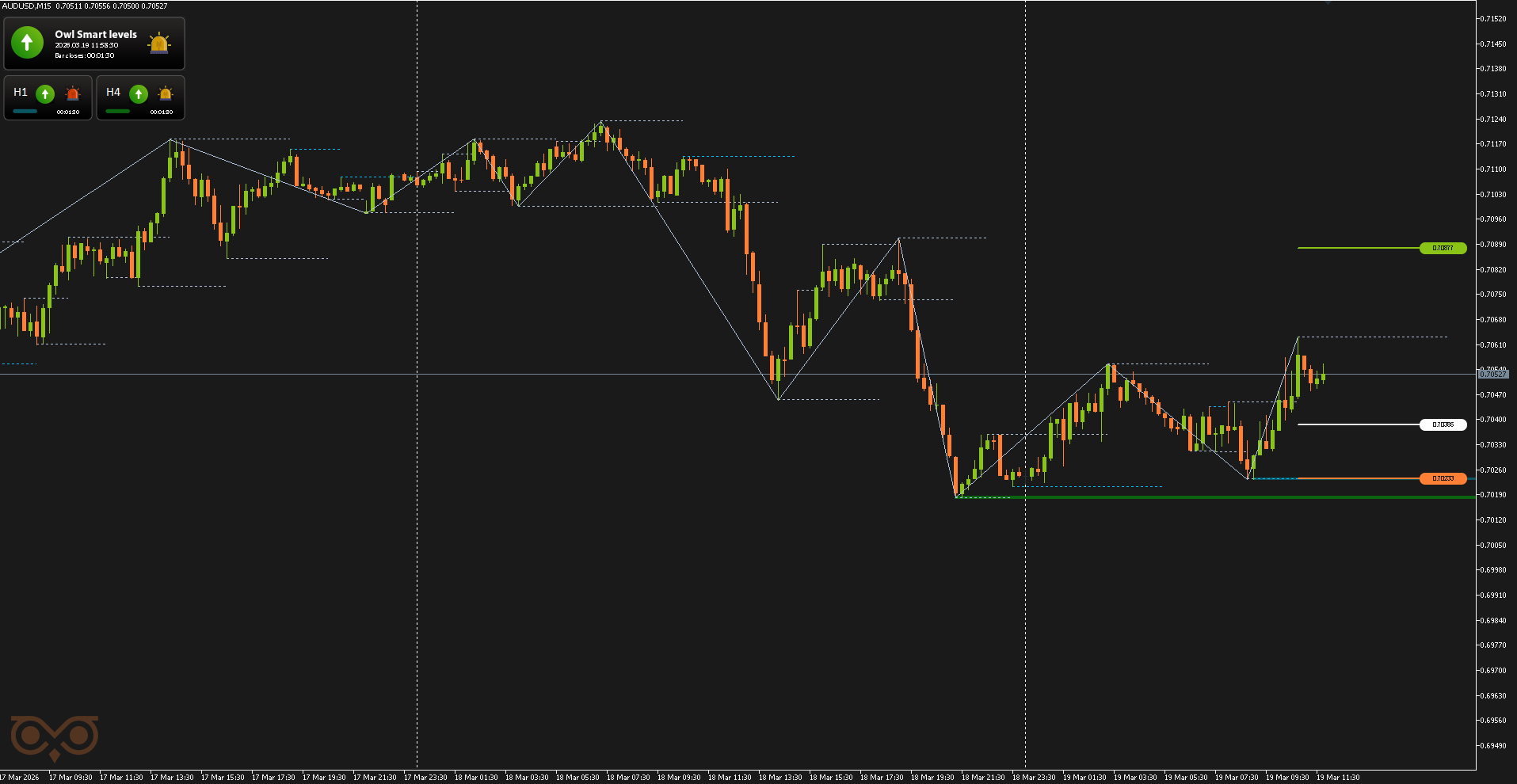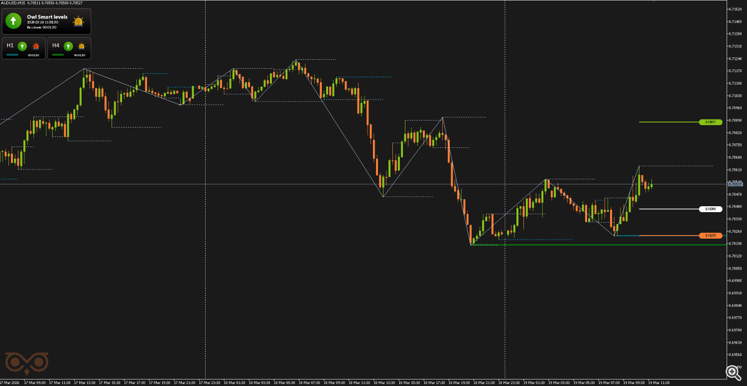 The second AUDUSD trade was opened on March 19 after a new buy signal from the Owl Smart Levels indicator. At that moment, the market continued its local uptrend after the previous bullish impulse.