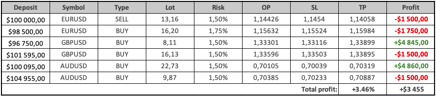 During the last trading week, a total of 6 trades were opened based on Owl Smart Levels signals across EURUSD, GBPUSD, and AUDUSD. Although several trades were stopped out, the overall result remained positive thanks to a 1:3 risk/reward ratio. Two profitable trades fully covered the losses and generated a net gain.