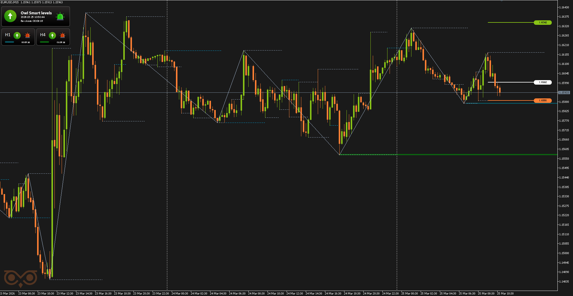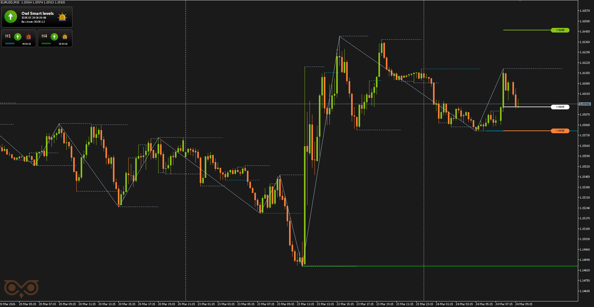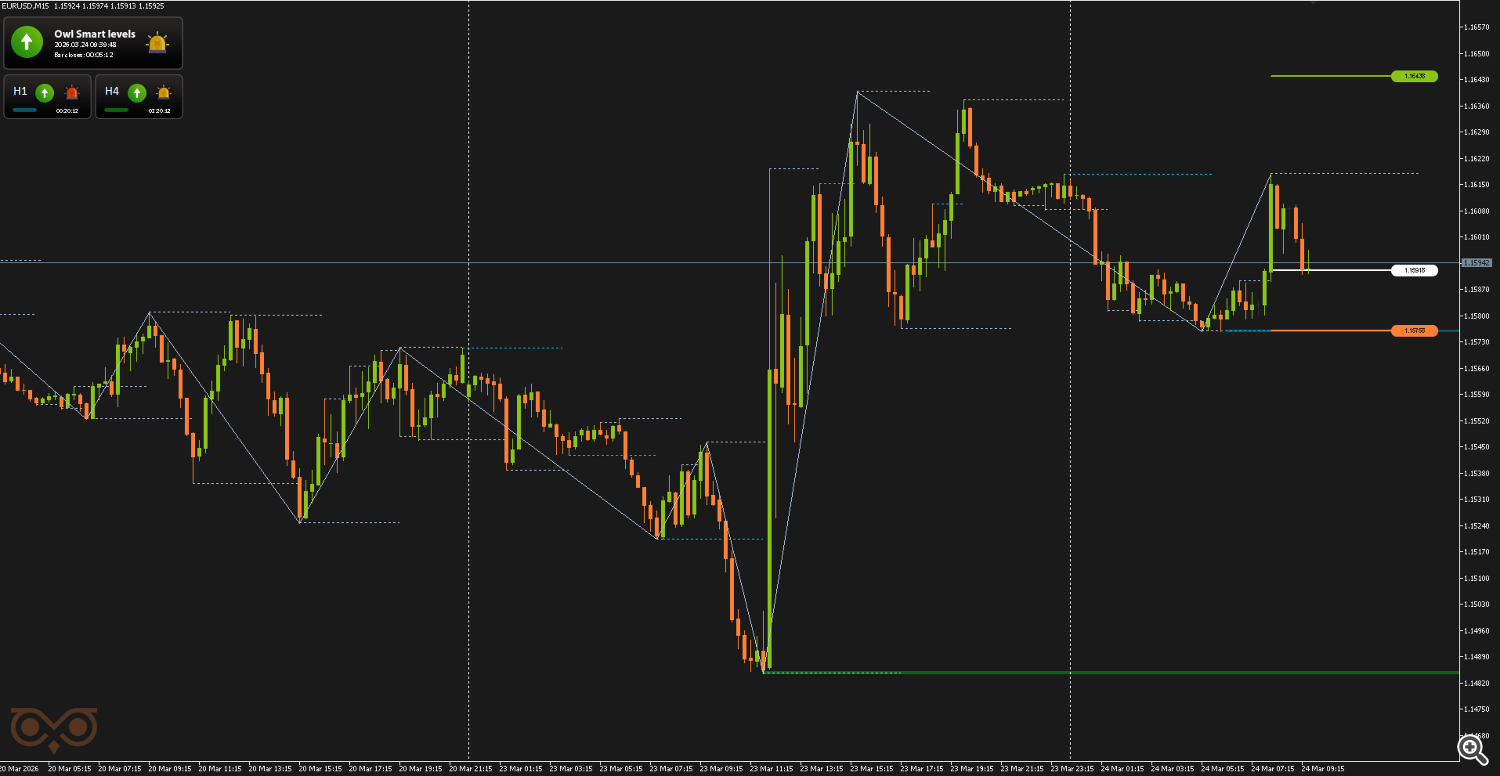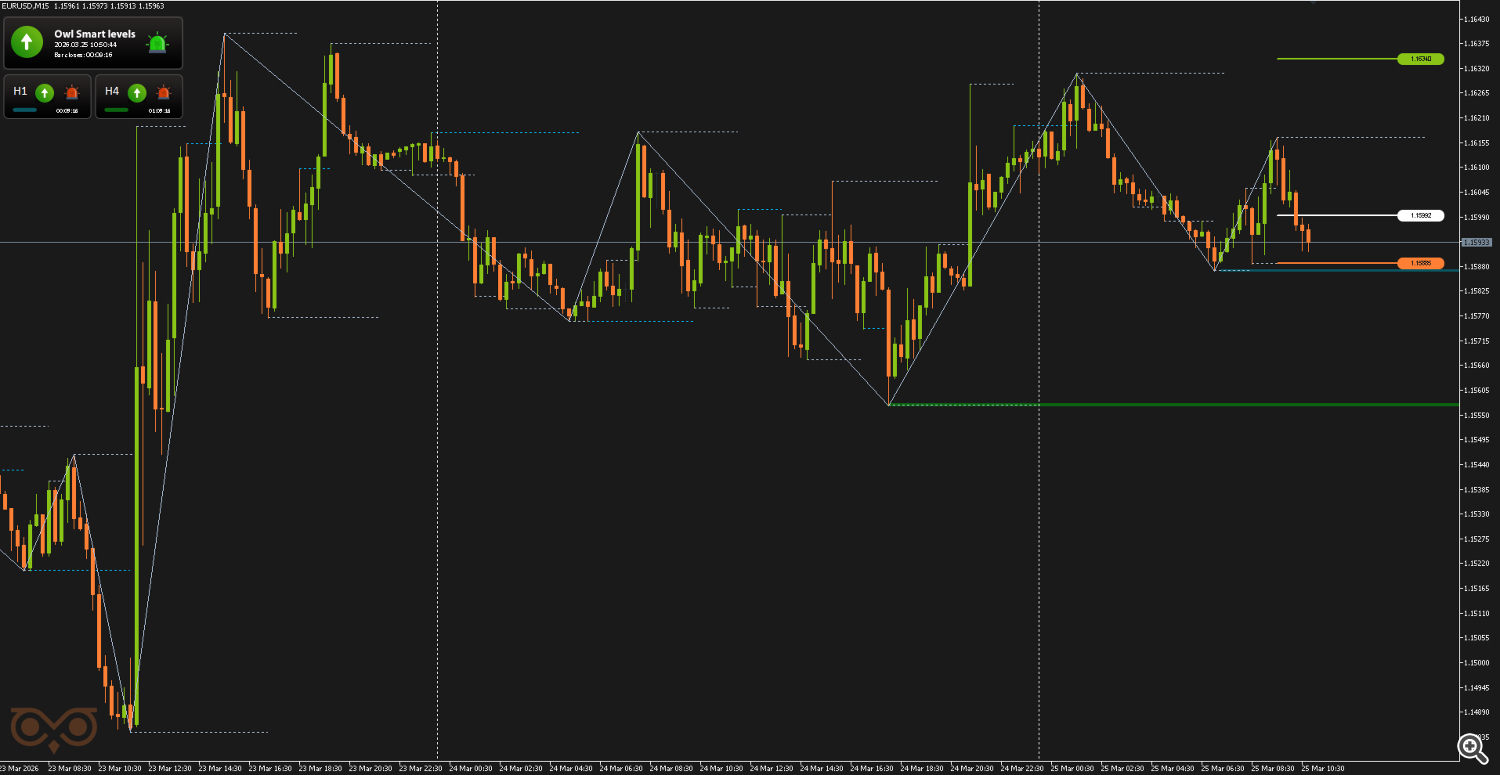 The first trade on the EURUSD pair was opened on March 24, 2026, after a buy signal from the Owl Smart Levels indicator. Before the entry, the market showed a strong upward impulse, followed by a pullback phase. Despite the pullback, the overall scenario remained bullish, so the main idea was to catch the continuation after price returned to the working zone.