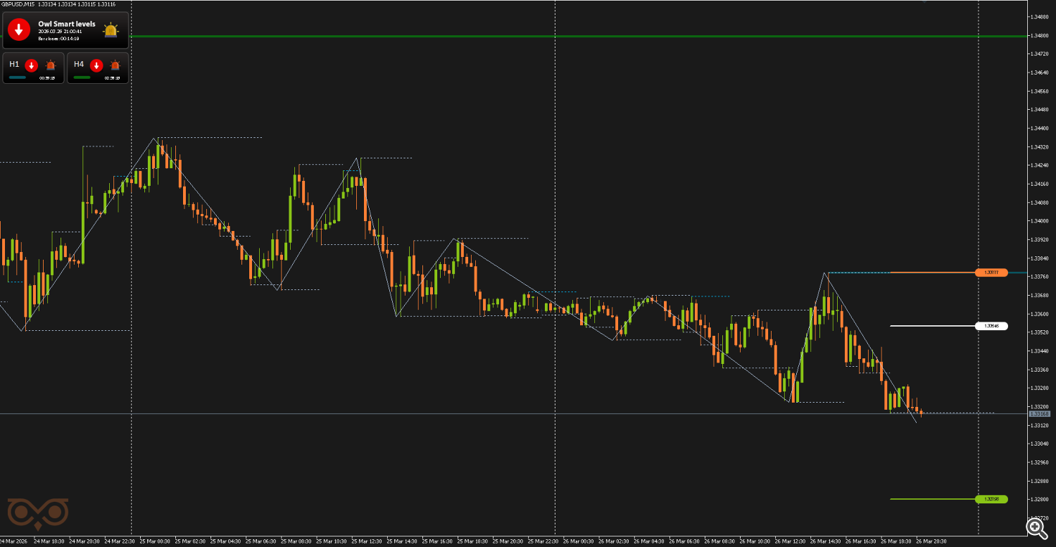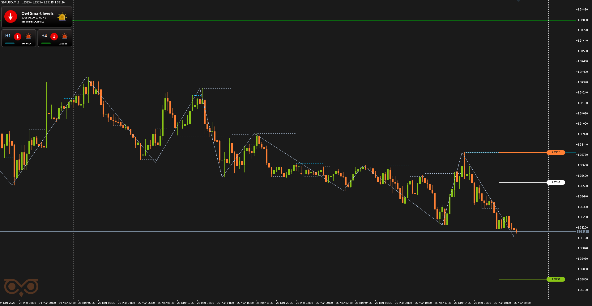 The first and only GBPUSD trade was opened on March 26, 2026, after a sell signal from the Owl Smart Levels indicator. All three time frames pointed to the priority of a bearish movement, so the indicator considered only sell trades. After that, a correction point was identified, and a position was opened from that point.