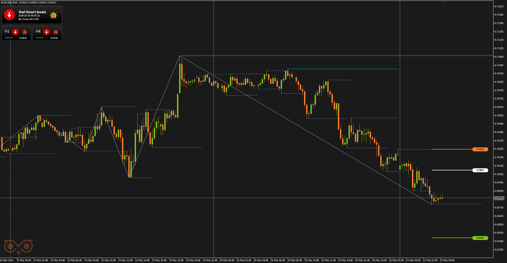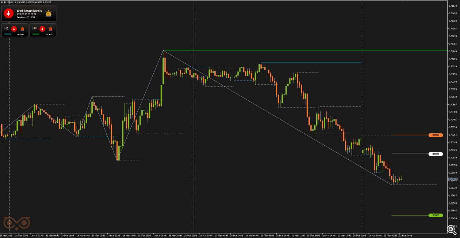 The first AUDUSD trade was opened on March 23, 2026, after a sell signal from the Owl Smart Levels indicator. At that moment, the indicator maintained its focus on the downward trend, so only short scenarios were considered.
