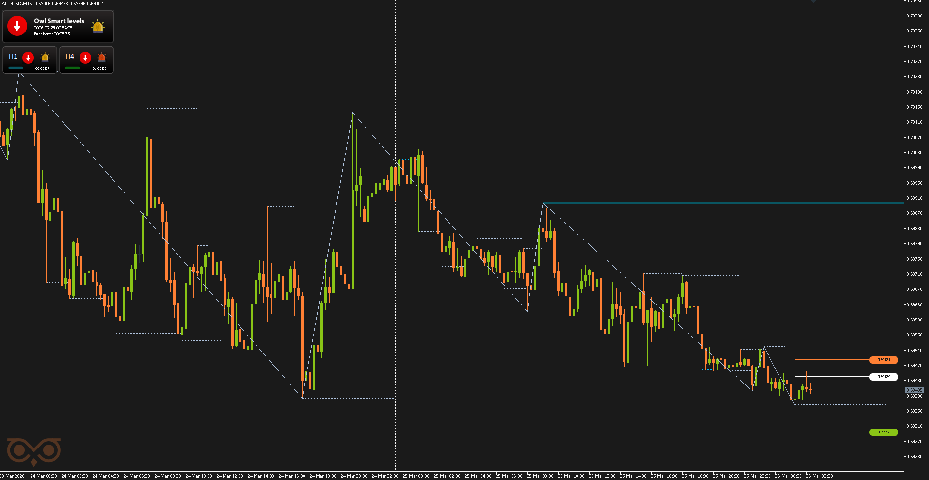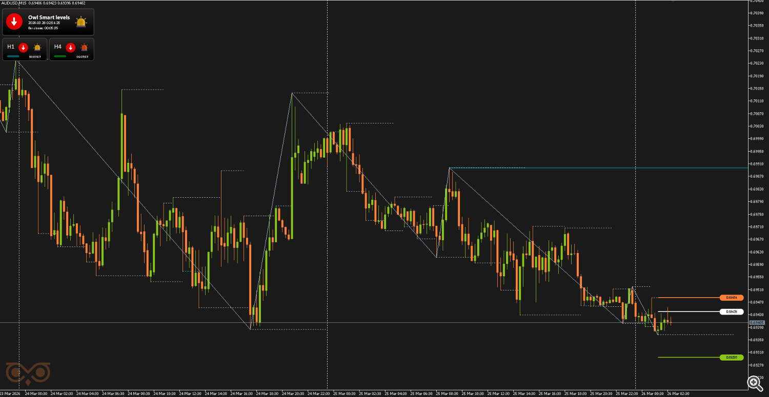 The second AUDUSD trade was opened on March 26, 2026, after another sell signal from the Owl Smart Levels indicator. At that time, the indicator continued to show a downward trend, so only short setups were considered. After a pullback, the price returned to the zone identified by the indicator for position entry, where the trade was opened.
