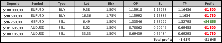 Most entries this week did not follow through and were closed at StopLoss. Although one of the short trades on GBPUSD reached its target and delivered a strong profit, it was not enough to offset the series of losing trades on EURUSD and AUDUSD.