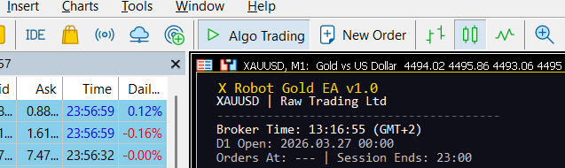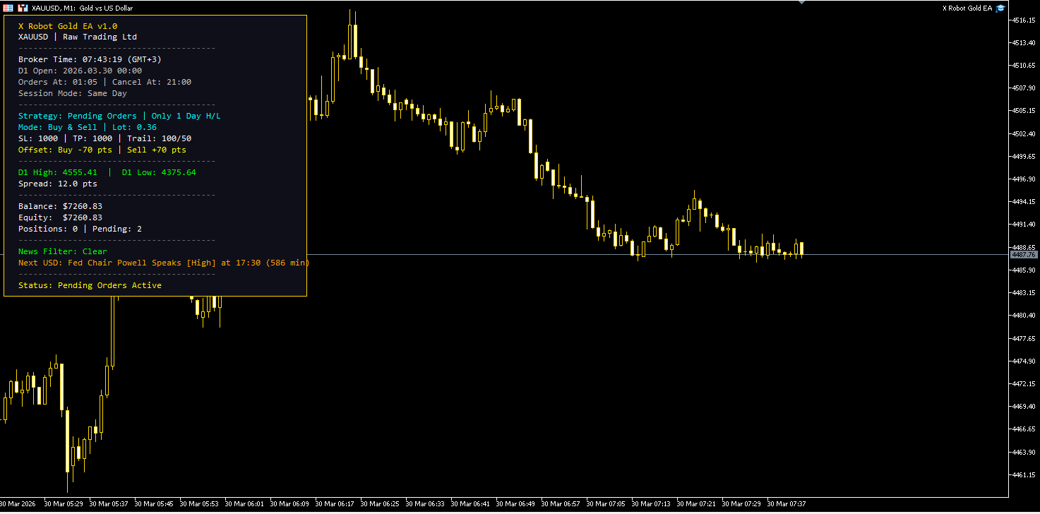 X Robot Gold EA is now fully active, utilizing its precise entry logic, slippage guards, and news filters to manage your account with mathematical discipline.