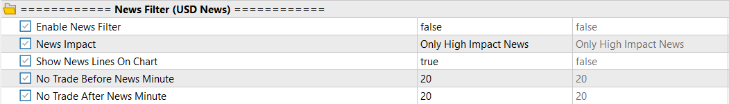 Enable News Filter: Set to True to pull live USD High-Impact or Medium-Impact event data from Forex Factory. The EA will automatically pause trading, close open positions, and cancel pending orders during the news window.