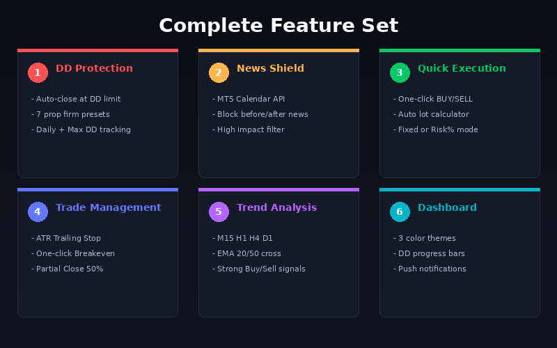 PropTrade Manager is a trade management Expert Advisor for MetaTrader 5 designed from the ground up to solve this exact problem. It combines one-click execution, real-time drawdown monitoring, and automatic position protection into a single professional dashboard.