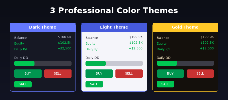 Three color themes are available: Dark (best for long sessions), Light (good visibility in bright environments), and Gold (premium look for gold traders).