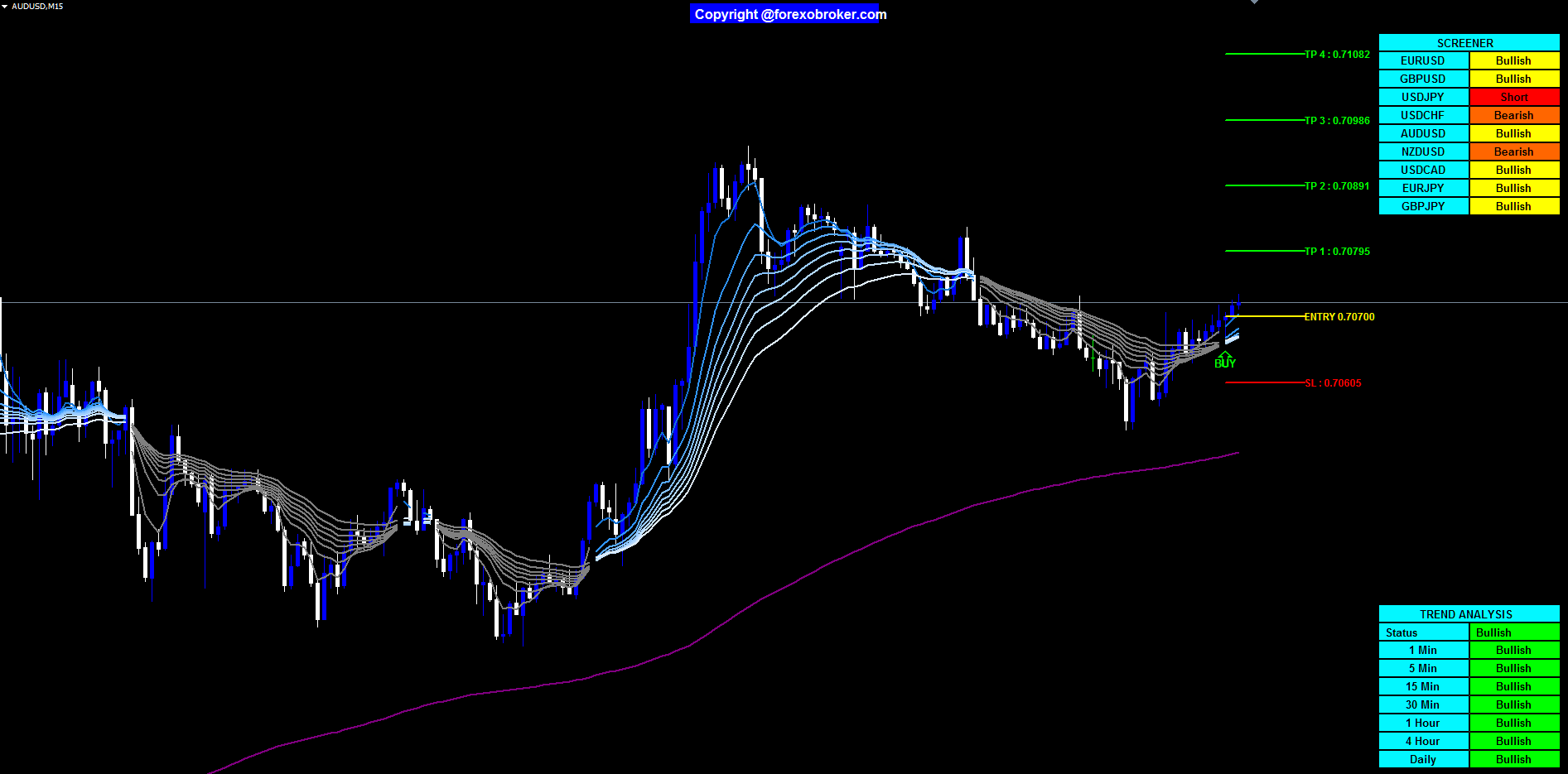 Figure 1: AUDUSD M15 with a fully fanned amber ribbon following a sharp rally. All eight EMA lines are stacked in correct bullish order with the 5-period line leading and the 34-period line trailing. The live BUY trade zone is visible on the right edge of the chart, and both the screener (top-right) and the trend dashboard (bottom-right) are active.